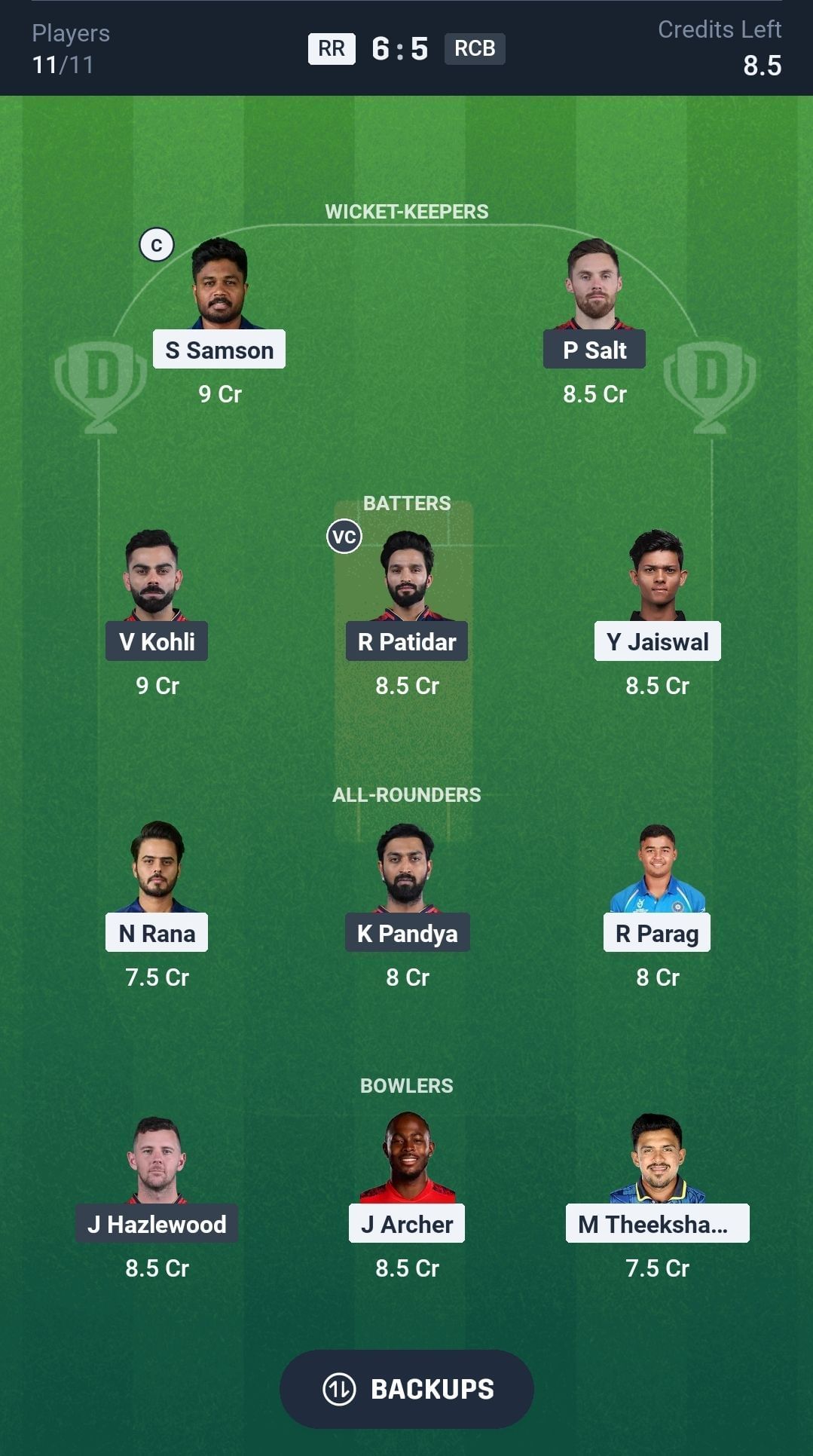 Batters: V Kohli, R Patidar, Y Jaiswal