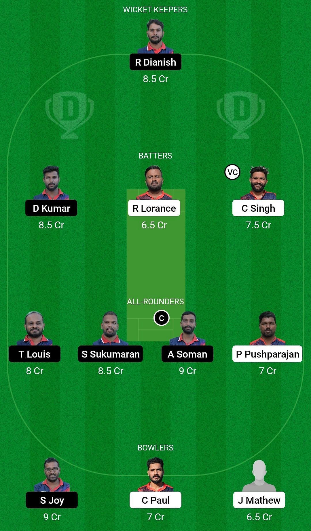Royal Strikers Probable Playing XI: Thanseer Thahir, Chamkaur Singh, Roshan Lorance, Priyan Pushparajan (c), Manuel Augustine (wk), Kushlesh Koppaka, Sebin Thomas, Arjun Jose, Jais Mathew, Allam Bala, and Clinto Paul.