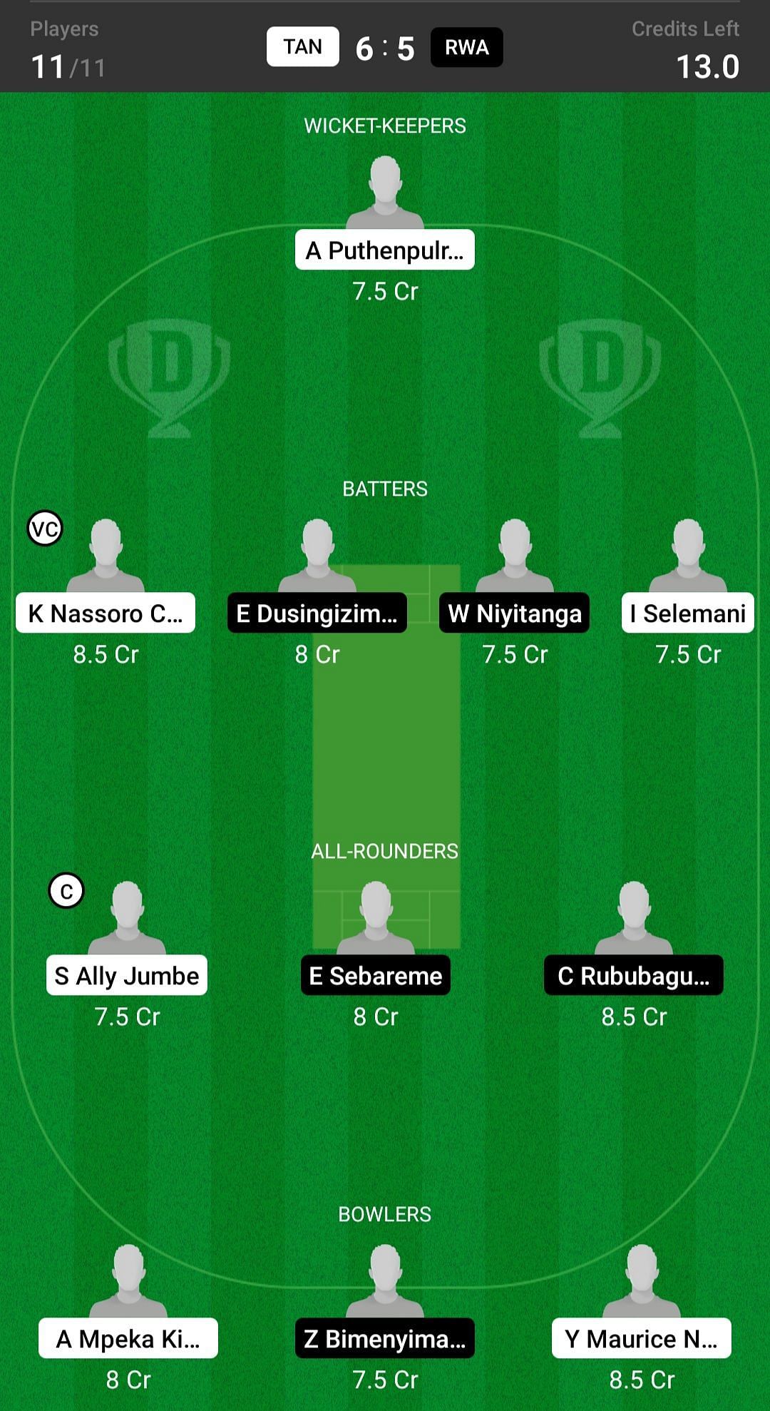 W Niyitanga and E Dusingizimana are the two best batter picks for the Dream11 team. K Nassoro has played exceptionally well in the last few matches, so he is also a good pick for today's Dream11 team.