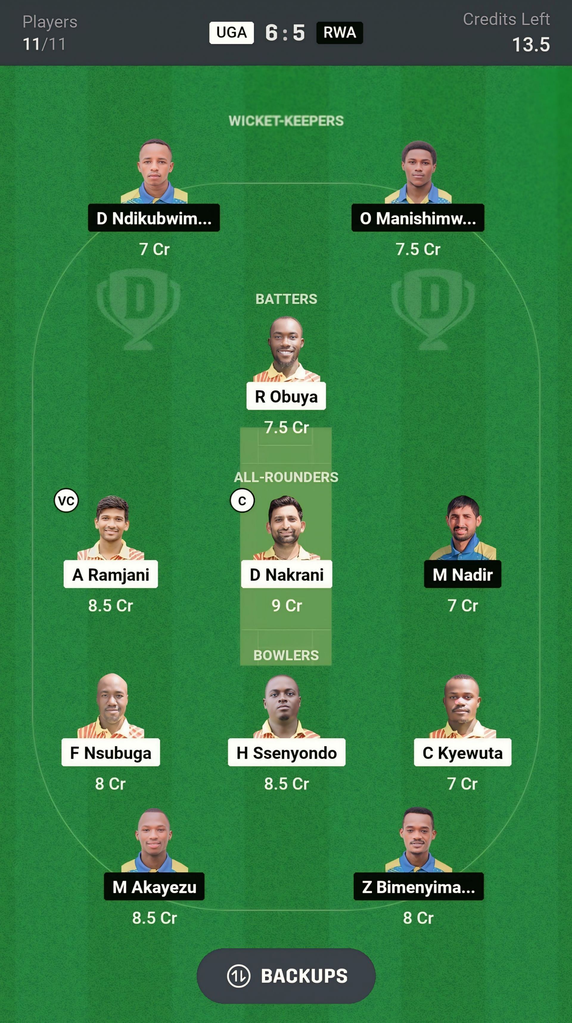 D Nakrani is the most crucial pick from Uganda as the pitch is expected to support both bowlers and batters. He will bat in the top order and complete his quota of overs in today's match. He has smashed 41 runs and taken five wickets in the last three matches.