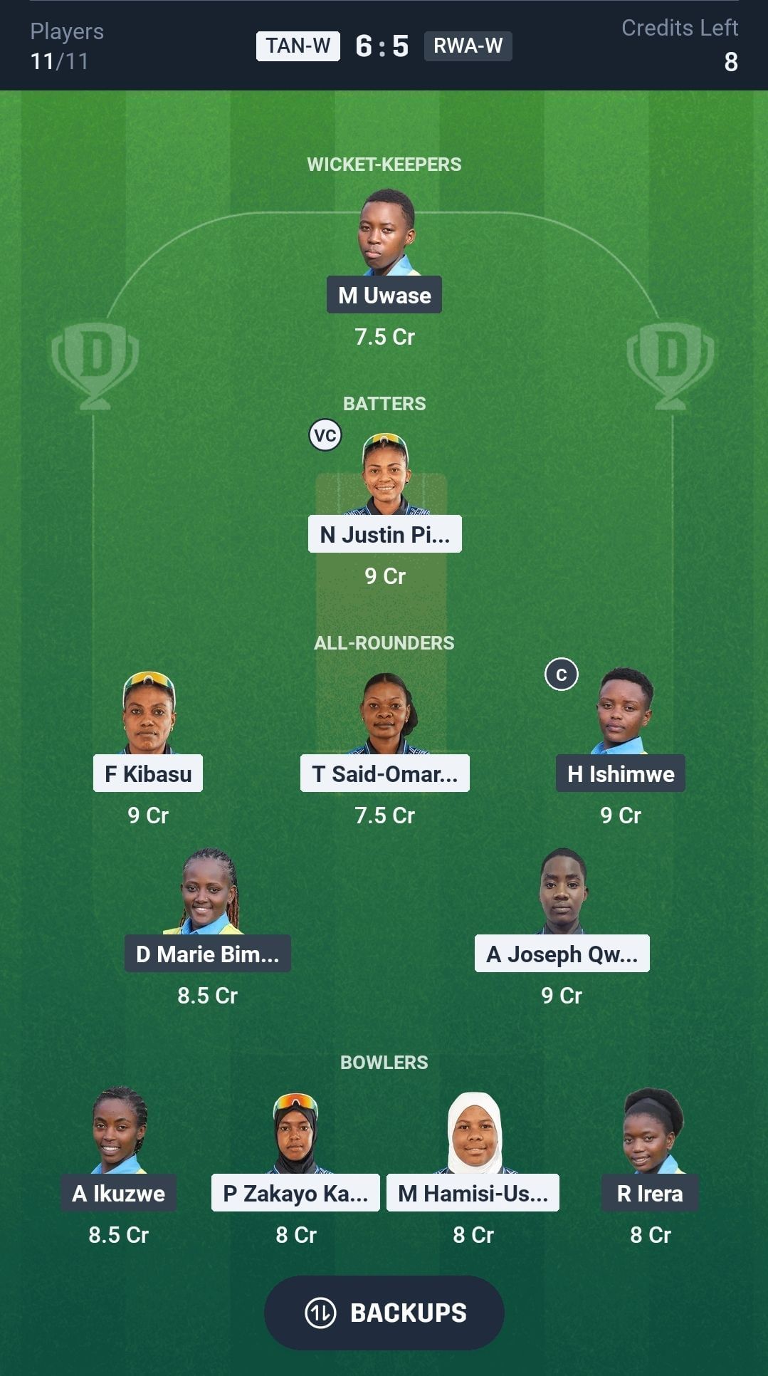 C Umutoniwase and N Justin are the two best batter picks for today's Dream11 team. N Justin will bat in the middle order and complete her quota of overs. She has smashed 268 runs and taken 5 wickets in the last eight matches. S Niyomuhoza is another good batter pick for today's match.