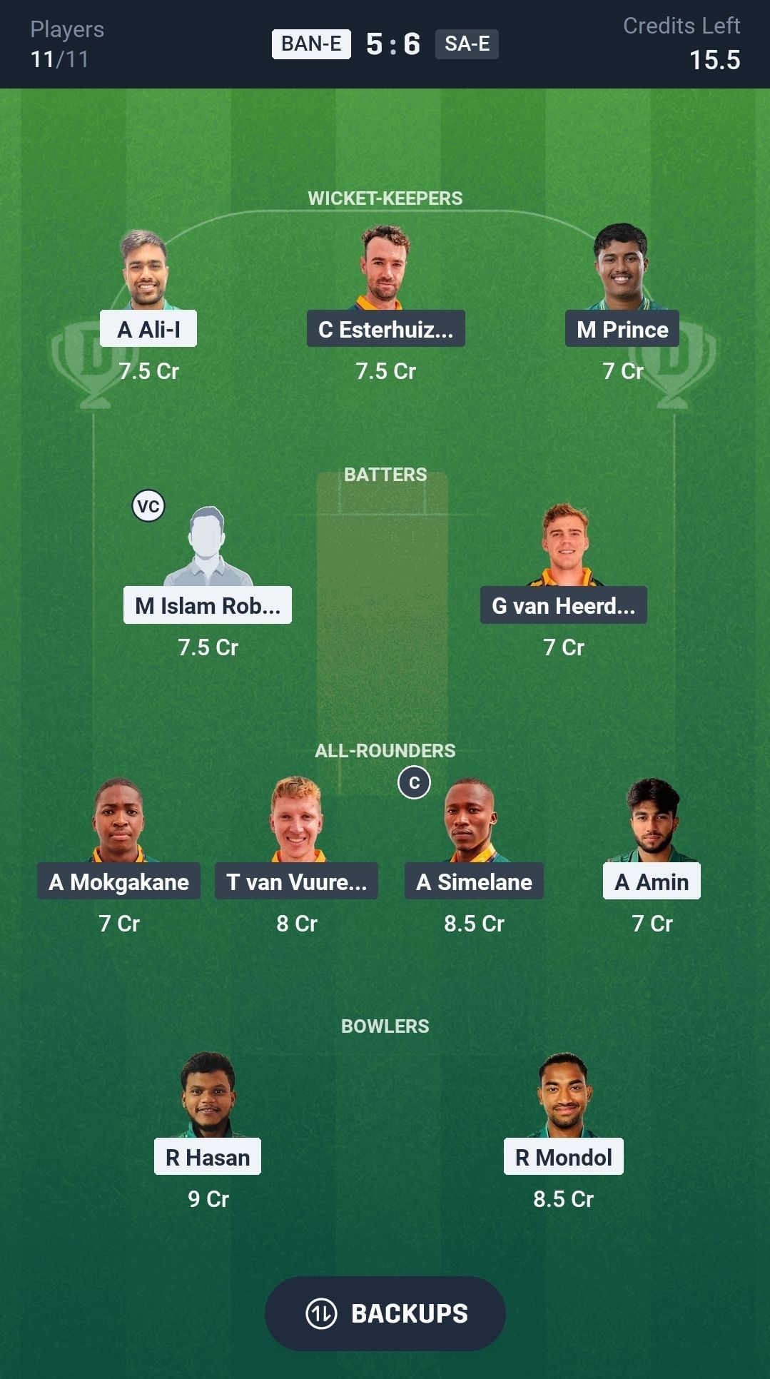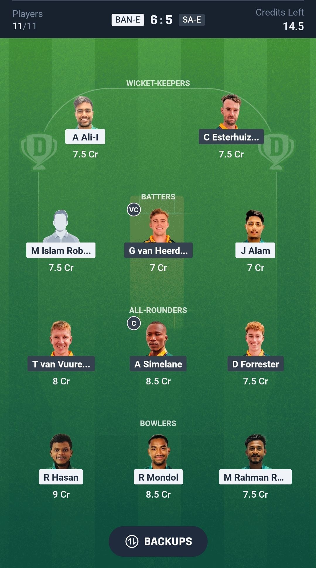 J Alam and M Islam Robin are the two best batter picks for today's Dream11 team. M Islam Robin is a hard hitter who can smash a lot of runs in today's match. He can play a good innings against South Africa Emerging. He smashed 87 runs in the last match. G van Heerden is another good batter for today's match.