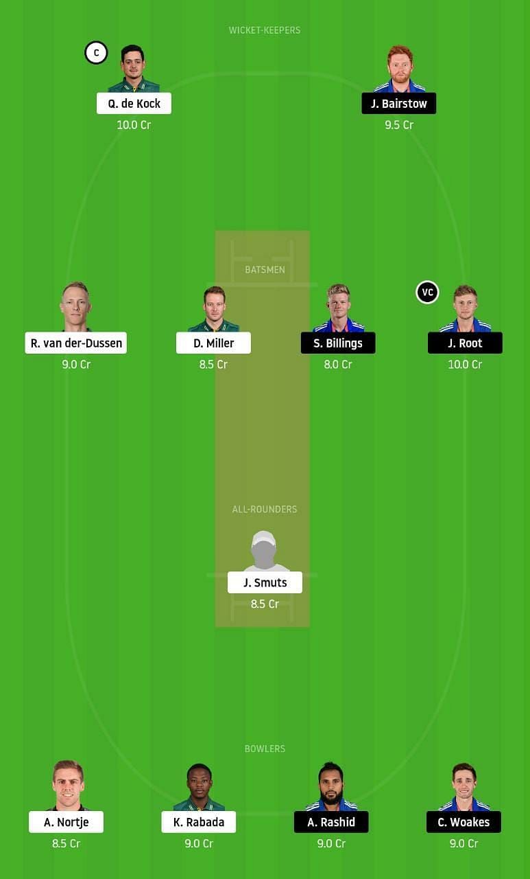 Fantasy Suggestion #1: Quinton de Kock, Jonny Bairstow, Rassie van der Dussen, David Miller, Sam Billings, Joe Root, JJ Smuts, Anrich Nortje, Kagiso Rabada, Chris Woakes and Adil Rashid