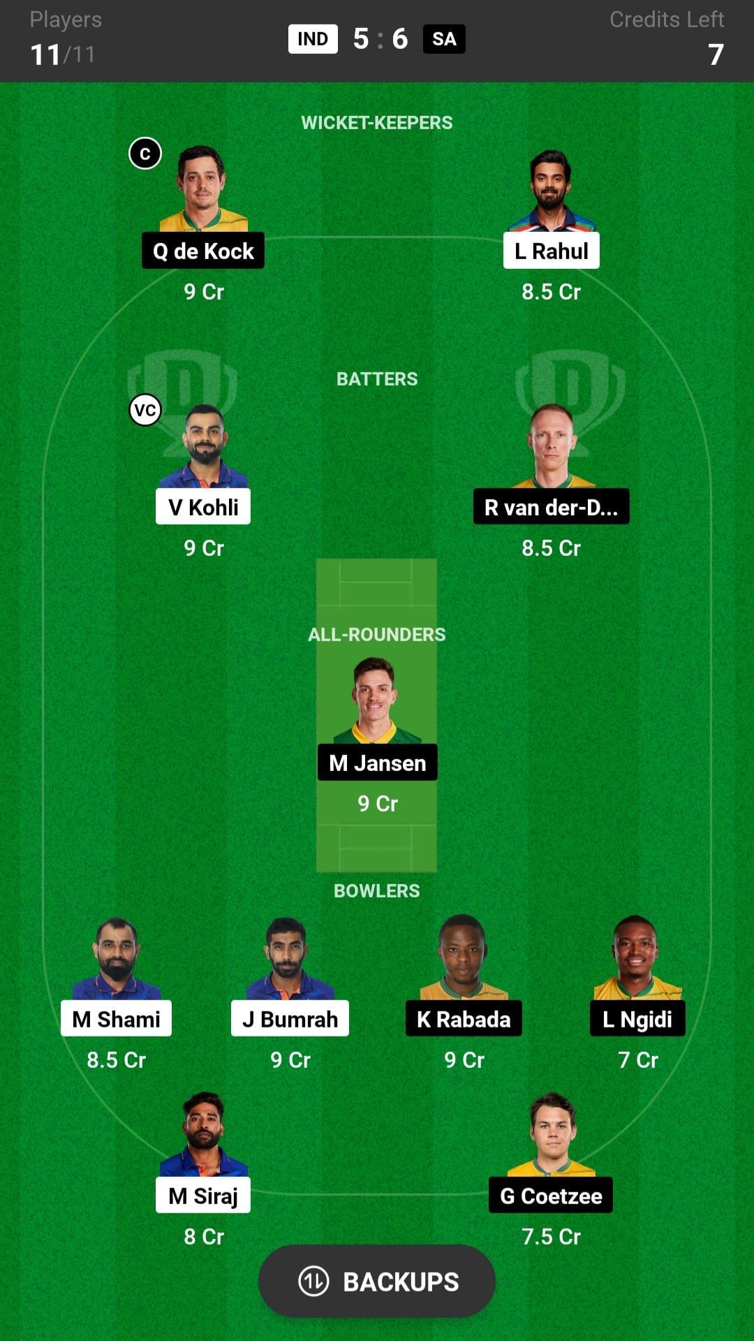 Bowlers: J Bumrah, M Shami, K Rabada, L Ngidi, M Siraj, G Coetzee