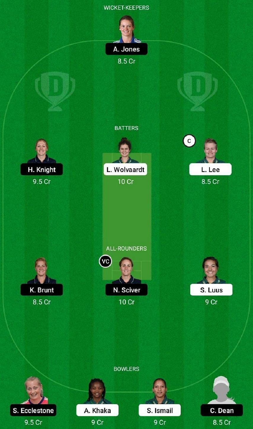 Fantasy Suggestion #1: Amy Jones, Heather Knight, Laura Wolvaardt, Lizelle Lee, Katherine Brunt, Nat Sciver, Sune Luus, Sophie Ecclestone, Ayabonga Khaka, Shabnim Ismail and Charlie Dean.