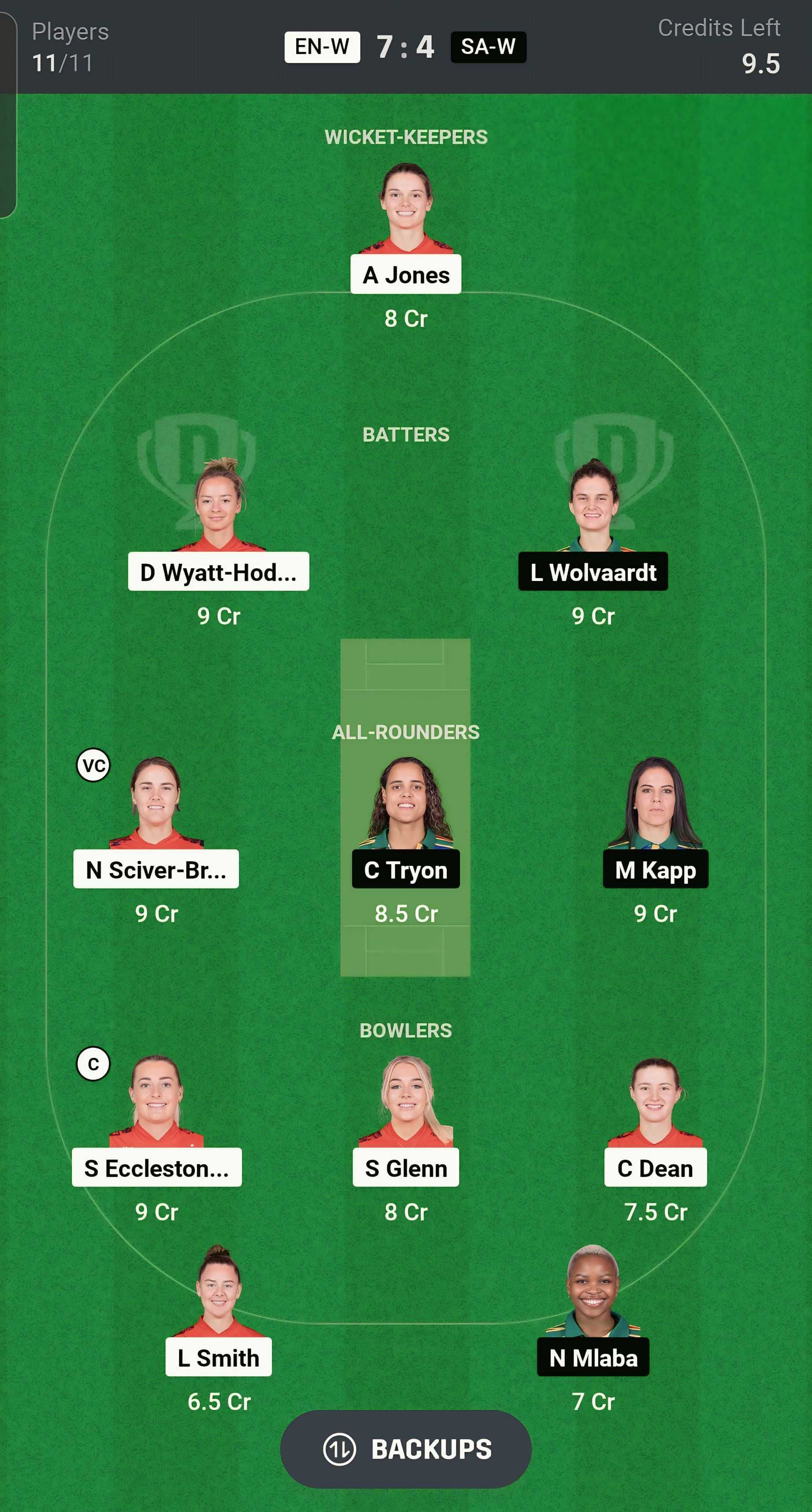 Marizanne Kapp and Nat Sciver Brunt are the best all-rounder picks for the Dream11 team. Both will play a crucial role for their teams in today's match. Marizanne Kapp will bat in top order and complete her quota of four overs. Chloe Tyron is another good all-rounder for today's match. She will bat in the middle order and complete her quota of four overs.