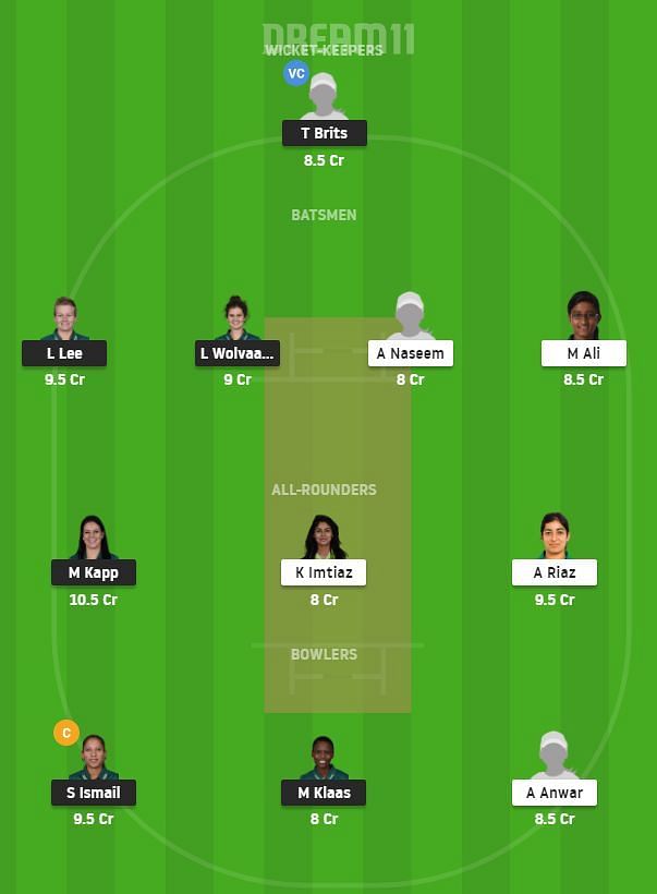 Fantasy Suggestion #1: Tazmin Britz, Mubeena Ali, Laura Wolvaardt, Lizelle Lee, Ayesha Naseem, Aliya Riaz, Marizanne Kapp, Kainat Imtiaz, Shabnim Ismail, Aimen Anwar and Masbata Klaas.