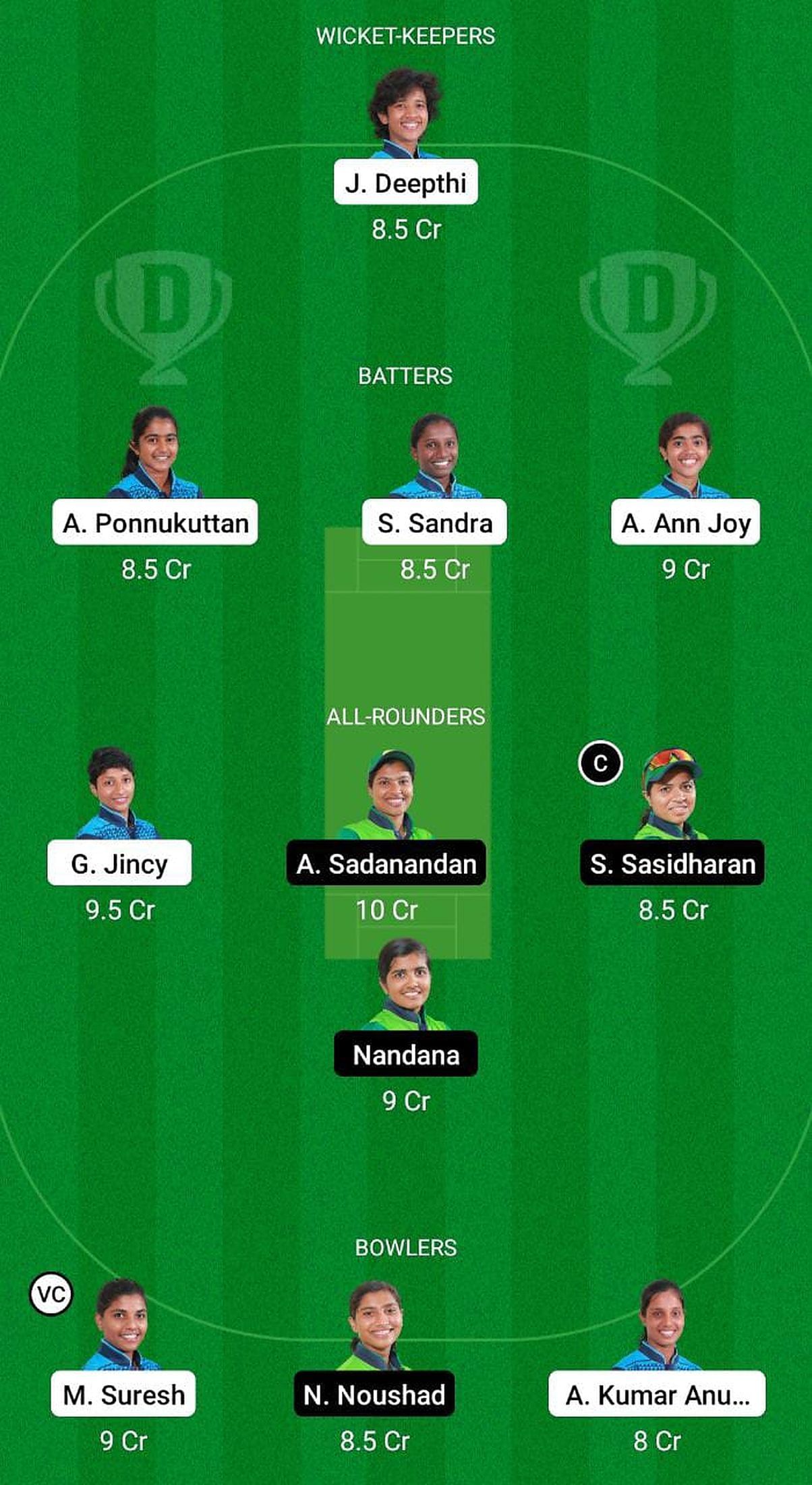 Jincy George (c), Deepthi S (wk), Mrudhula Suresh, Ananya K Pradeep, Akhila Ponnukuttan, Sandra Suren, Anusree Anilkumar, Manasvi Potti, Aleena Ann Joy, Aswathy M, Feba Fathum.