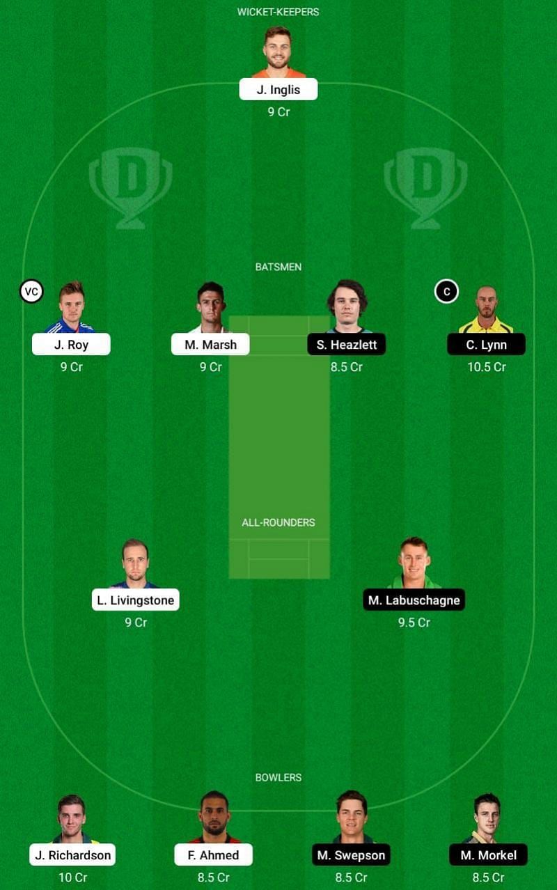 Fantasy Suggestion #1: Josh Inglis, Jason Roy, Chris Lynn, Sam Heazlett, Mitch Marsh, Liam Livingstone, Marnus Labuschagne, Jhye Richardson, Fawad Ahmed, Mitch Swepson and Morne Morkel