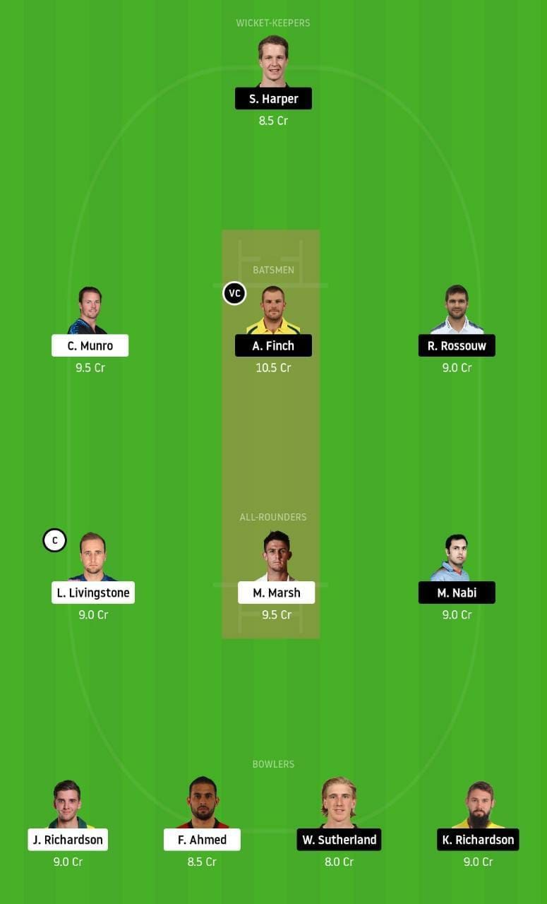 Fantasy Suggestion #1: Sam Harper, Aaron Finch, Rilee Rossouw, Colin Munro, Mitchell Marsh, Mohammad Nabi, Liam Livingstone, Kane Richardson, Jhye Richardson, Fawad Ahmed and Will Sutherland.