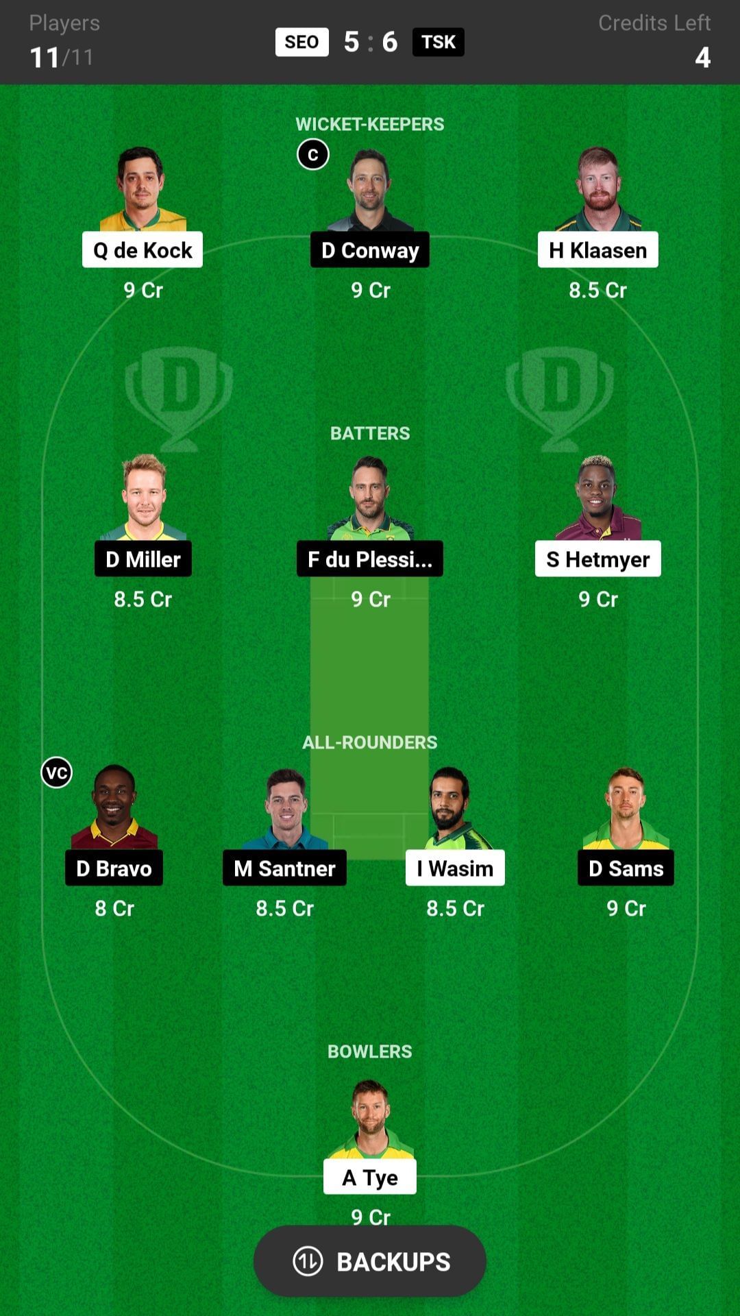 All-rounders: D Bravo, I Wasim, D Sams, M Santner, M Mohsin
