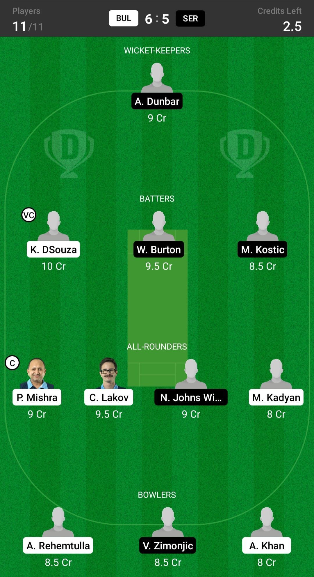 Captain: P Mishra Vice Captain: C Lakov