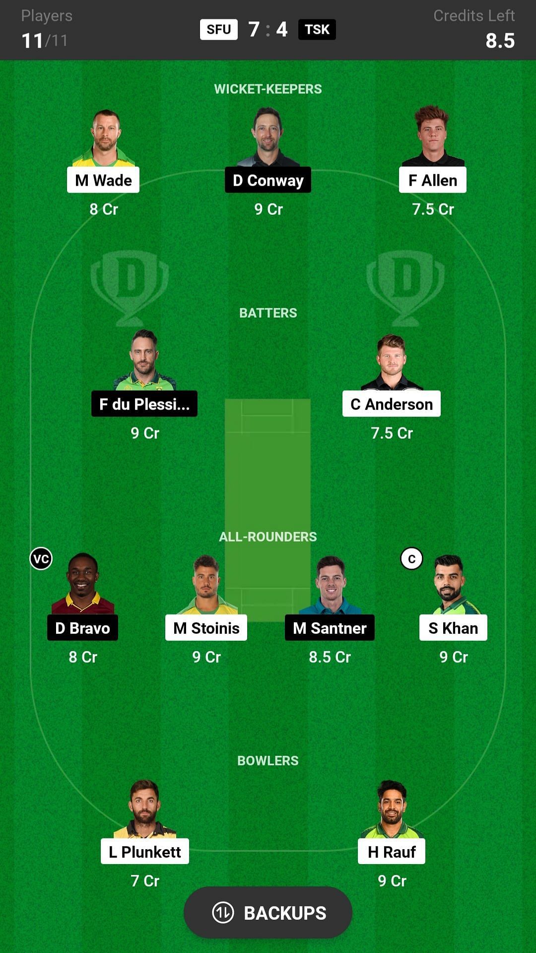 D Miller, Milind Kumar, F du Plessis (c), Devon Conway (wk), Zia Shahzad, C Chetty, Mohammad Mohsin, Mitchell Santner, D Sams, DJ Bravo, J Theron