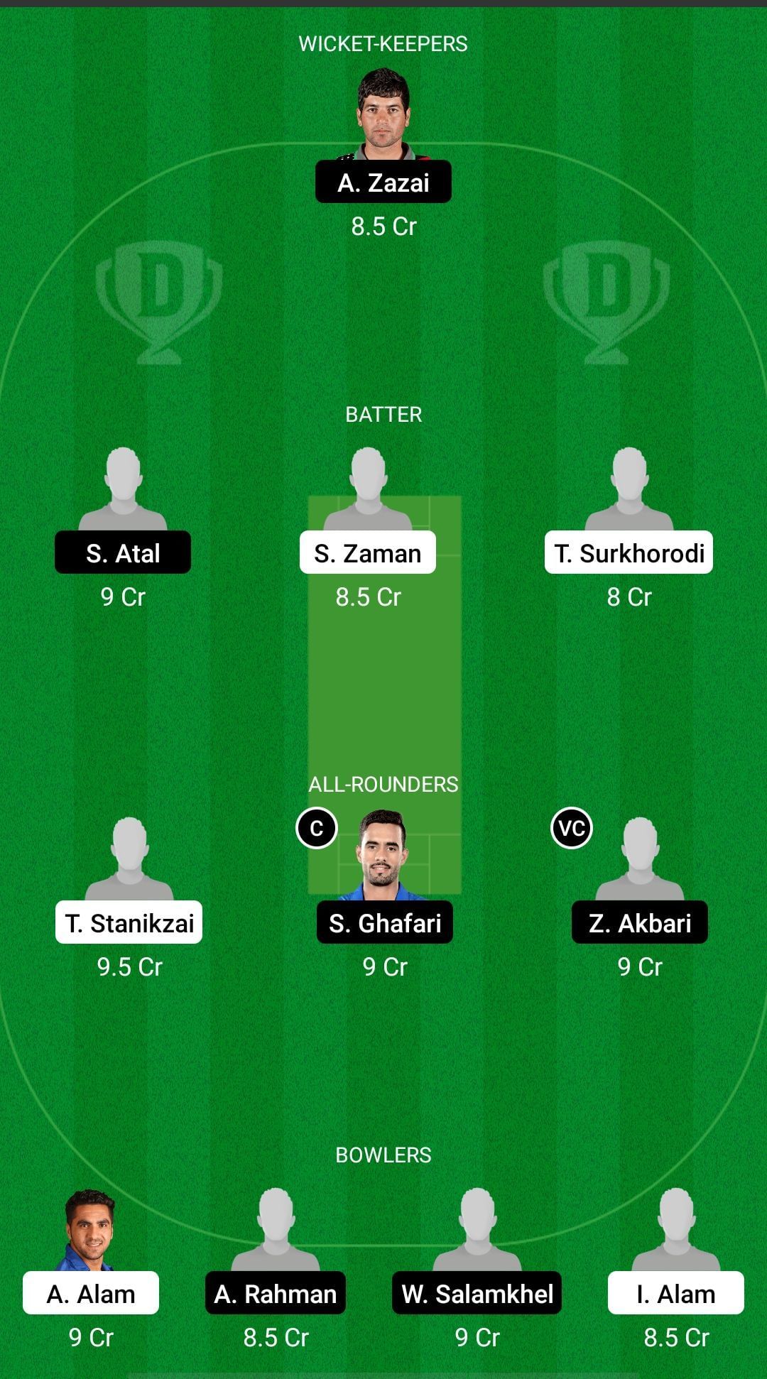 Fantasy Suggestion #1: Afar Zazai, Sediqullah Atal, Shawkat Zaman, Tamim Surkhorodi, Tariq Stanikzai, Shafiqullah Ghafari, Zubaid Akbari, Aftab Alam, Abdul Rahman, Waqar Salamkheil, Ismat Alam.