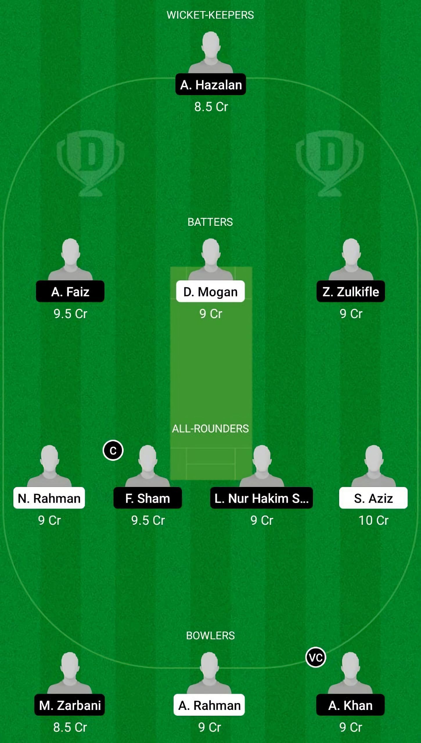 Fantasy Suggestion #1: A Hazalan, A Faiz, Z Zulkifle, D Mogan, F Sham, N Rahman, S Aziz, LNH Sahar, A Khan, M Zarbani, A Rahman