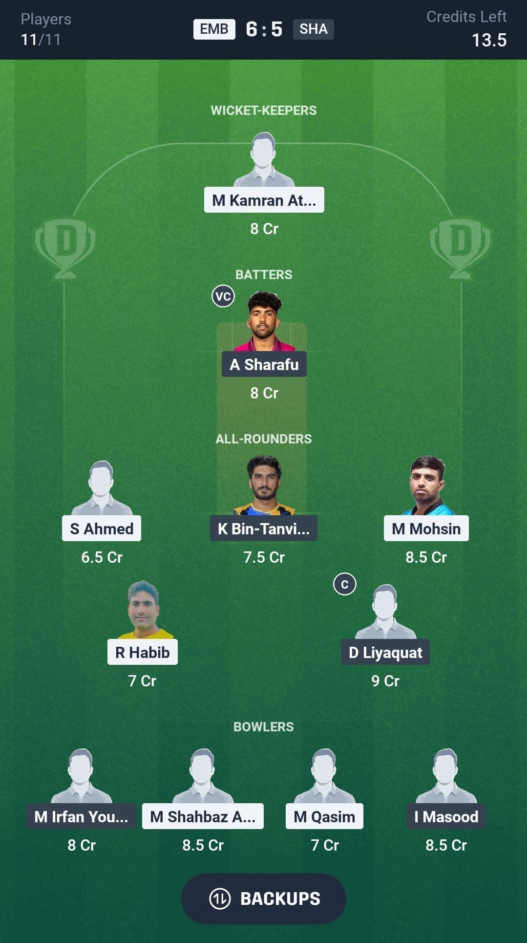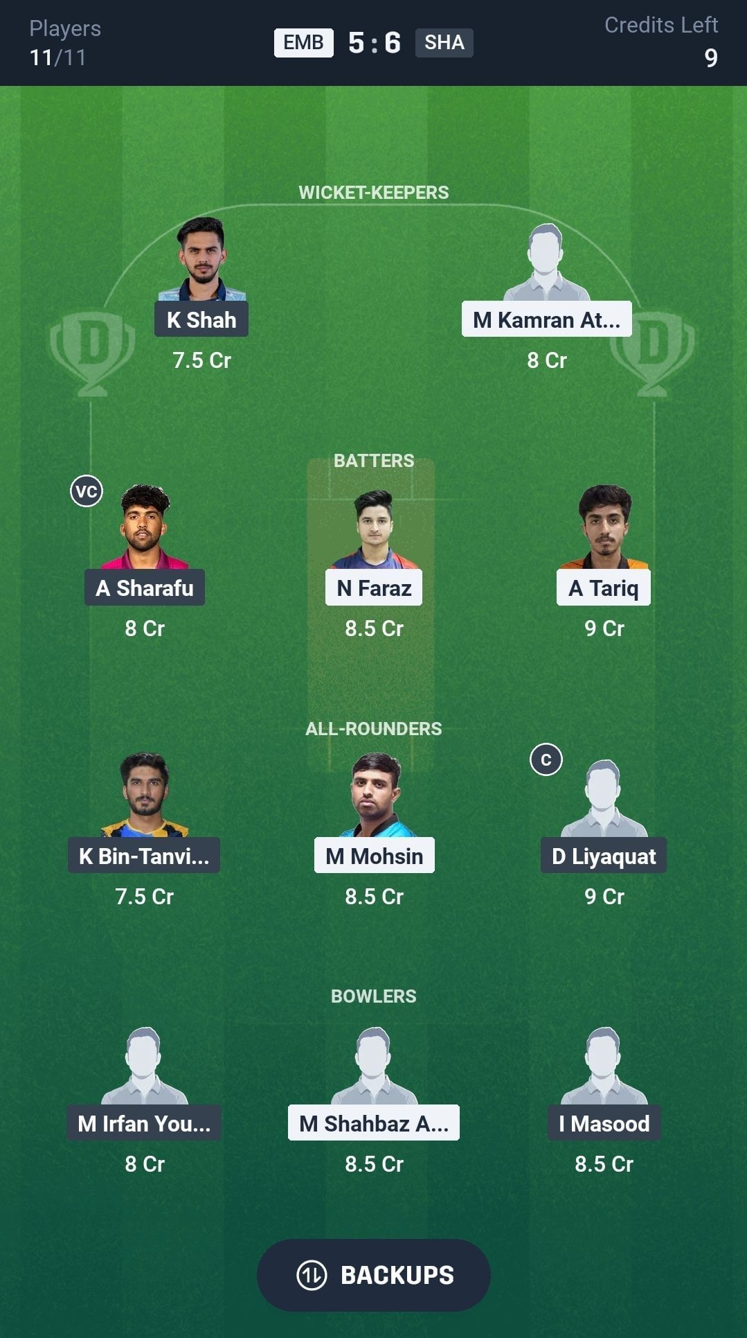 M Mohsin and D Liyaquat are the best all-rounders for the Dream11 team. Both players are crucial for today's match. D Liyaquat will bat in the top order and complete his quota of overs in today's match. He has smashed 246 runs and taken 6 wickets in the last 11 matches. K Bin Tanvir is another good all-rounder for today's nail-biting match.