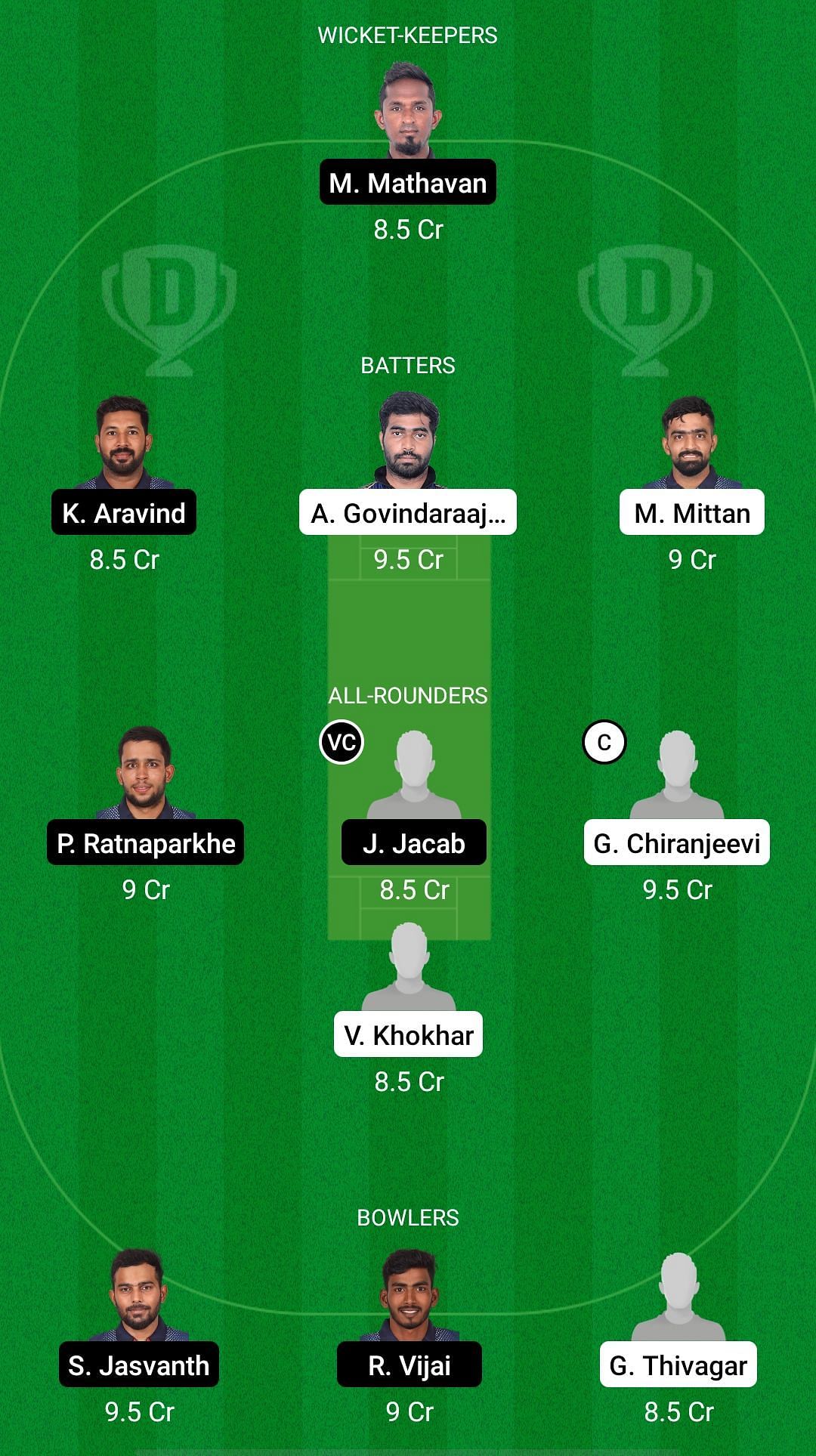 Fantasy Suggestion #1: Mathavan M, Aravind Kothandapani, AS Govindaraajan, Mohit Mittan, Paras Ratnaparkhe, Jullian Jacab, Chiranjeevi G, Vishal Khokhar, Jasvanth S, Vijaji Raja, Thivagar G.