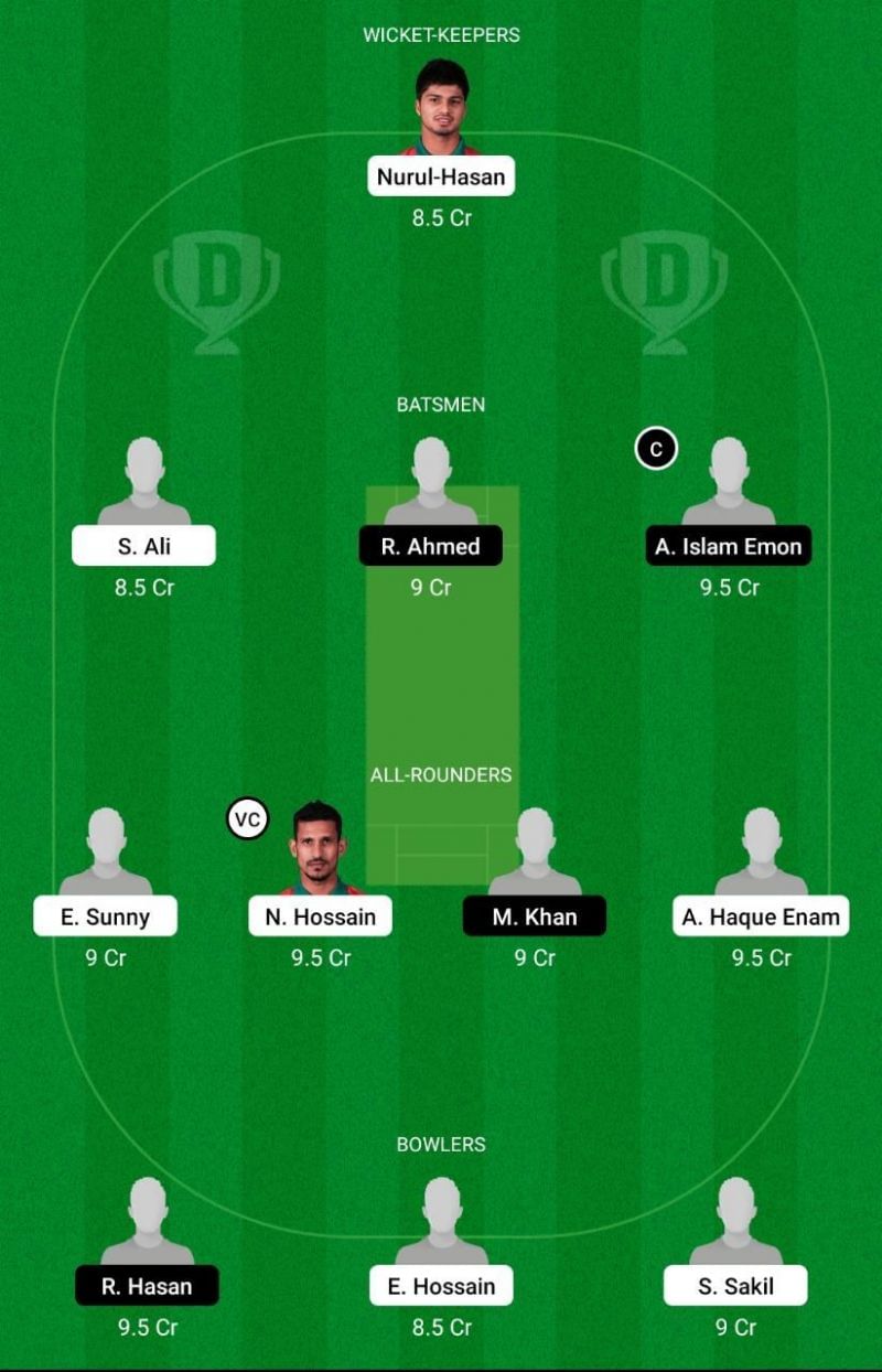 Fantasy Suggestion #1: Nurul Hasan, Anisul Islam Emon, Shykat Ali, Rakin Ahmed, Elias Sunny, Nasir Hossain, Mohammad Enamul, Salauddin Sakil, Rakibul Hasan, Ebadot Hossain, Mohaminul Khan.