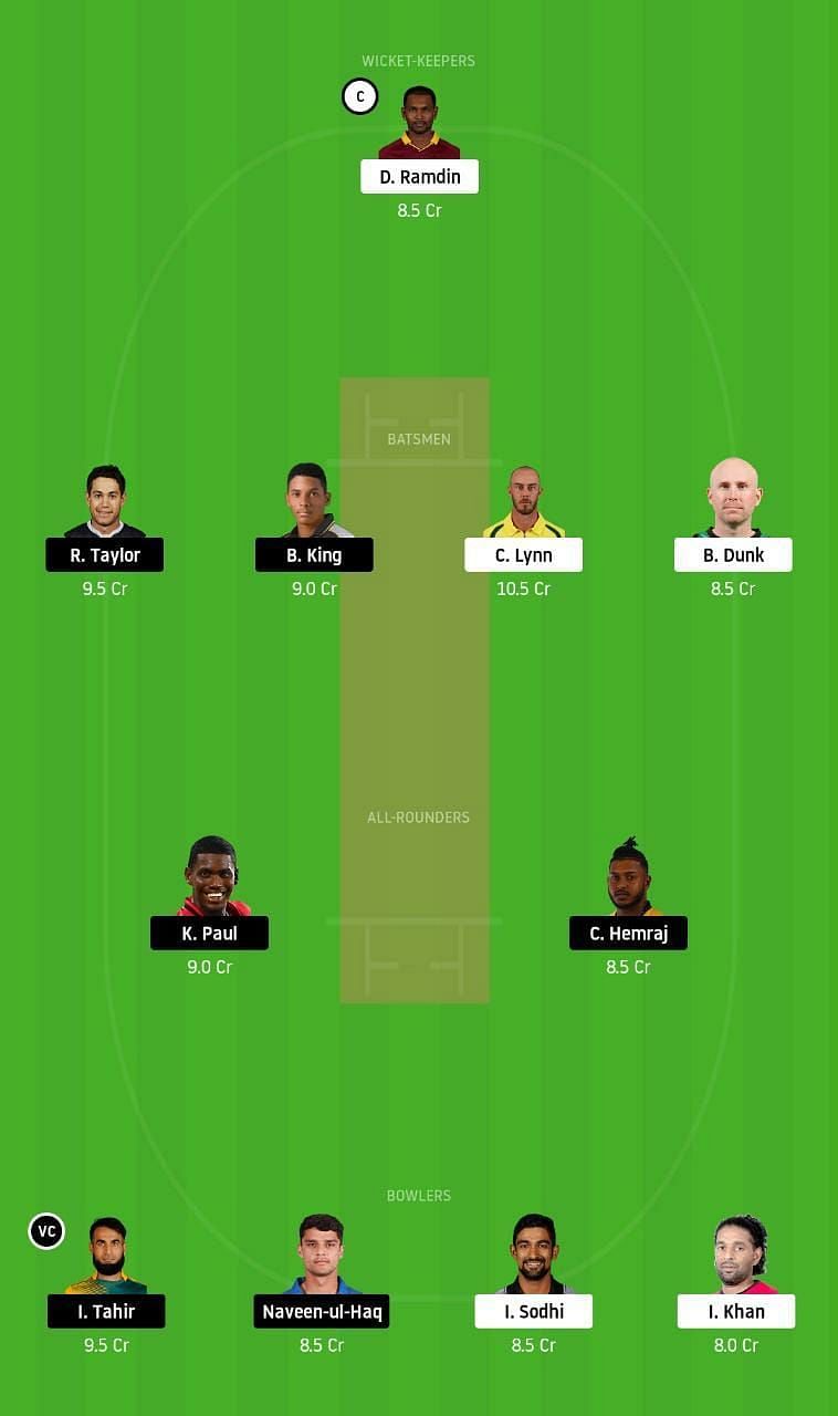 Fantasy Suggestion #1: Denesh Ramdin, Ben Dunk, Ross Taylor, Chris Lynn, Brandon King, Keemo Paul, Chanderpaul Hemraj, Imran Tahir, Naveen-ul-Haq, Imran Khan and Ish Sodhi