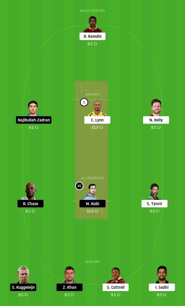 Fantasy Suggestion #1: Denesh Ramdin, Chris Lynn, Najibullah Zadran, Nick Kelly, Roston Chase, Mohammad Nabi, Sohail Tanvir, Sheldon Cottrell, Scott Kuggeleijn, Ish Sodhi and Zahir Khan