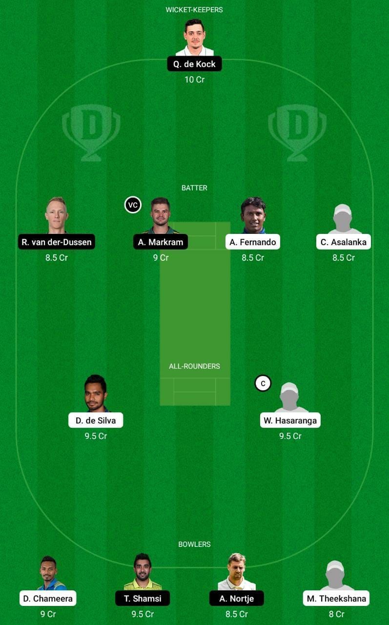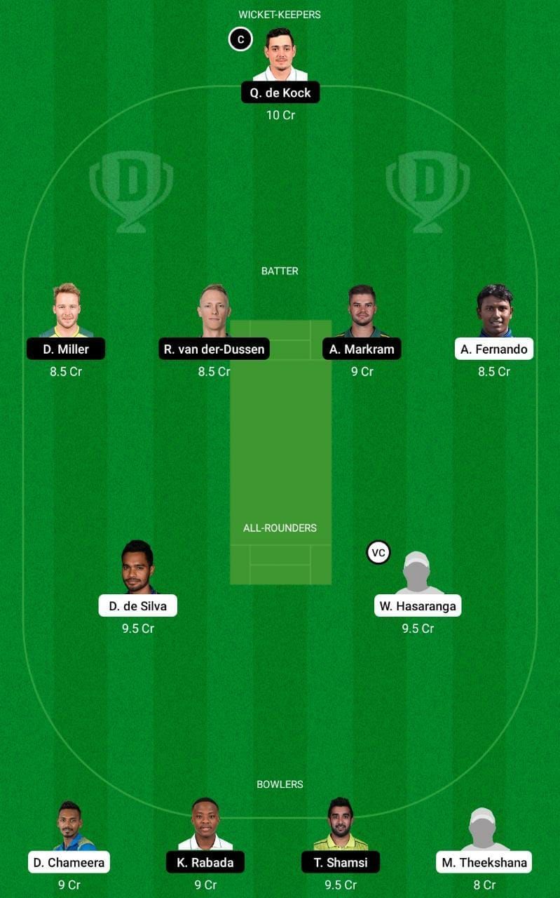 Fantasy Suggestion #1: Quinton de Kock, Aiden Markram, Avishka Fernando, David Miller, Rassie van der Dussen, Dhananjaya de Silva, Wanindu Hasaranga, Dushmantha Chameera, Maheesh Theekshana, Tabraiz Shamsi and Kagiso Rabada
