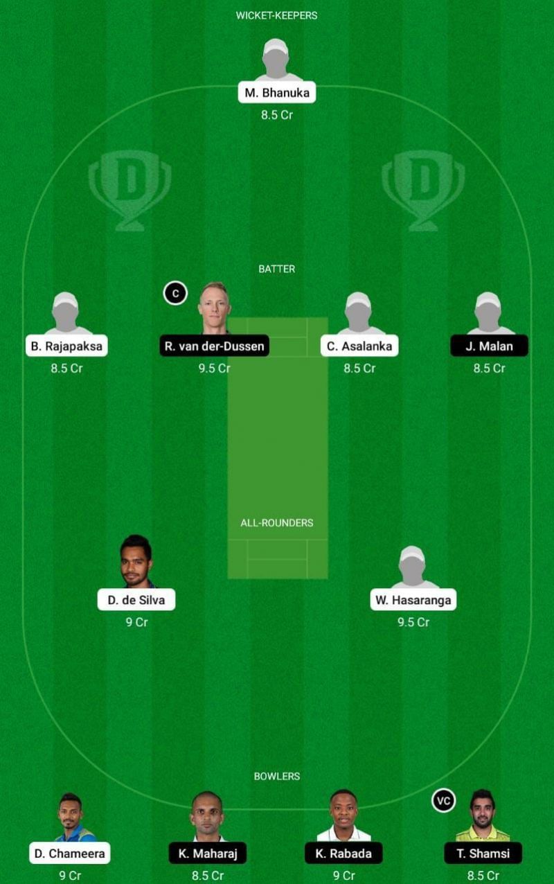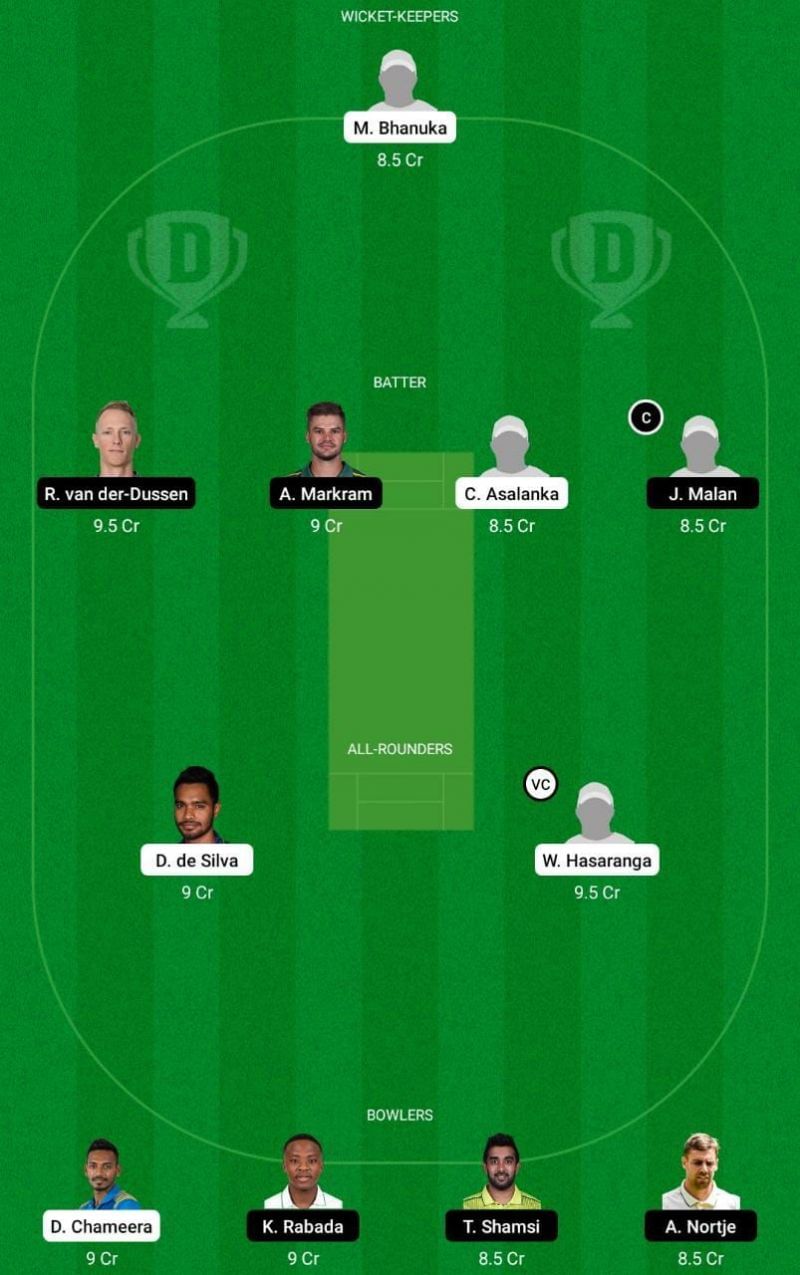 Fantasy Suggestion #1: Minod Bhanuka, Bhanuka Rajapaksa, Charith Asalanka, Janneman Malan, Rassie van der Dussen, Dhananjaya de Silva, Wanindu Hasaranga, Dushmantha Chameera, Keshav Maharaj, Kagiso Rabada and Tabraiz Shamsi