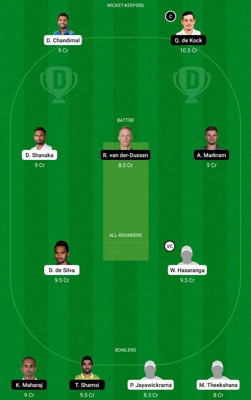 Fantasy Suggestion #1: Quinton de Kock, Kusal Perera, Dasun Shanaka, Rassie van der Dussen, Aiden Markram, Dwaine Pretorius, Wanindu Hasaranga, Keshav Maharaj, Tabraiz Shamsi, Praveen Jayawickrama and Maheesh Theekshana
