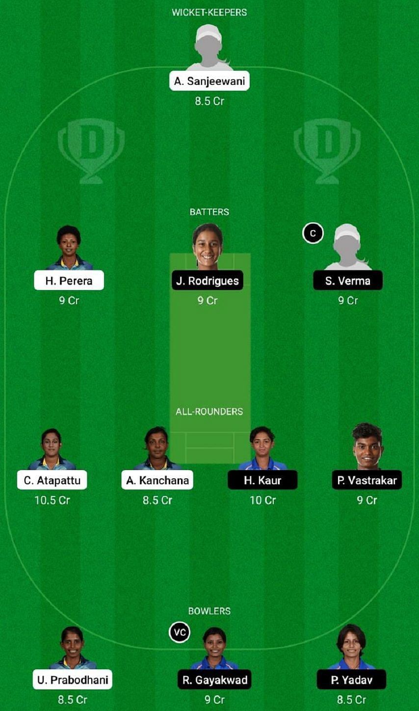 Fantasy Suggestion #2: A Sanjeewani, H Perera, J Rodrigues, S Verma, C Athapaththu, H Kaur, P Vastrakar, U Prabodhani, R Gayakwad, P Yadav and A Kanchana.