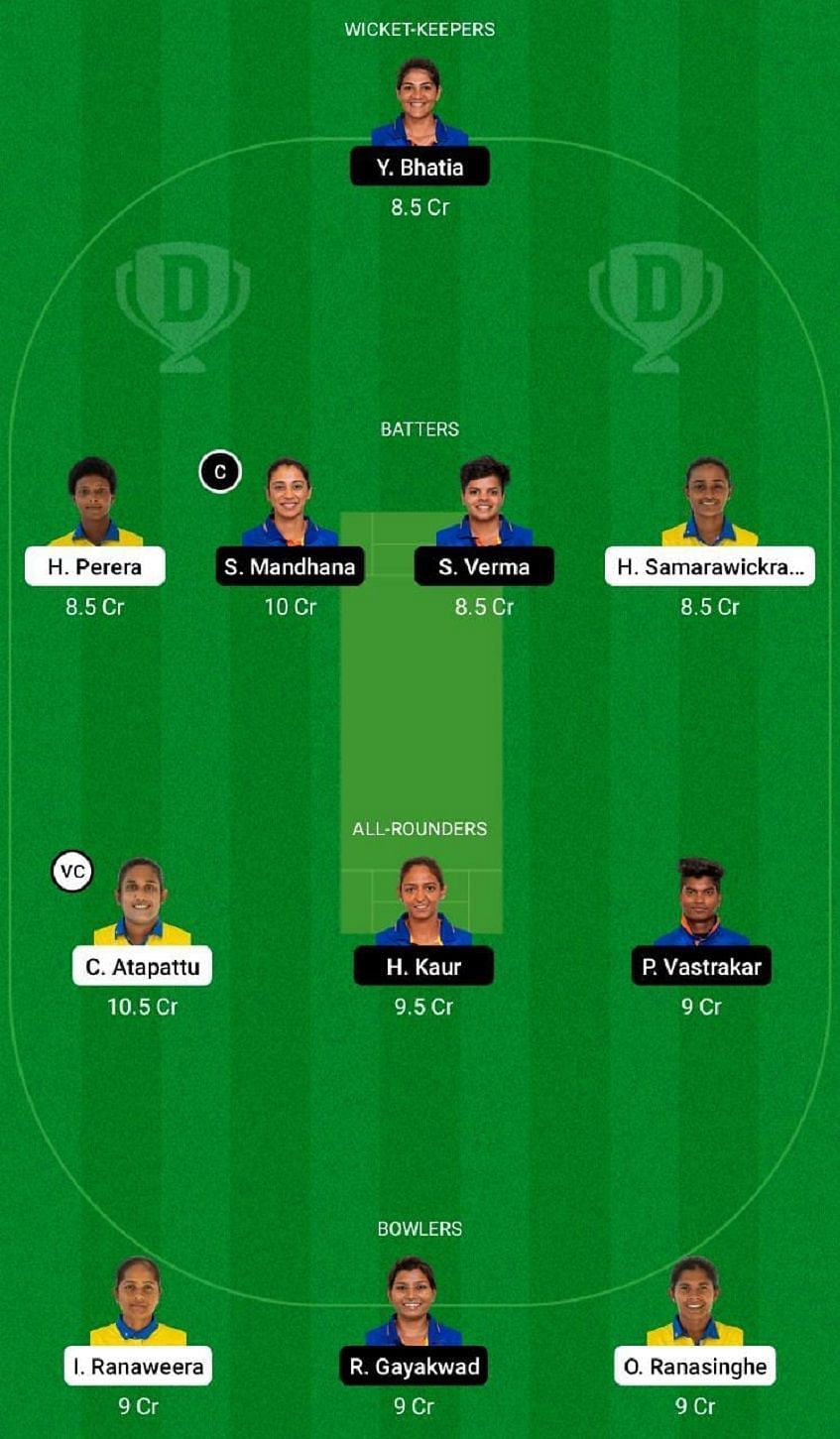 Fantasy Suggestion #1: Yastika Bhatia, Hasini Perera, Smriti Mandhana, Shafali Verma, Harshitha Madavi, Chamari Athapaththu, Harmanpreet Kaur, Pooja Vastrakar, Inoka Ranaweera, Rajeshwari Gayakwad and Oshadi Ranasinghe.