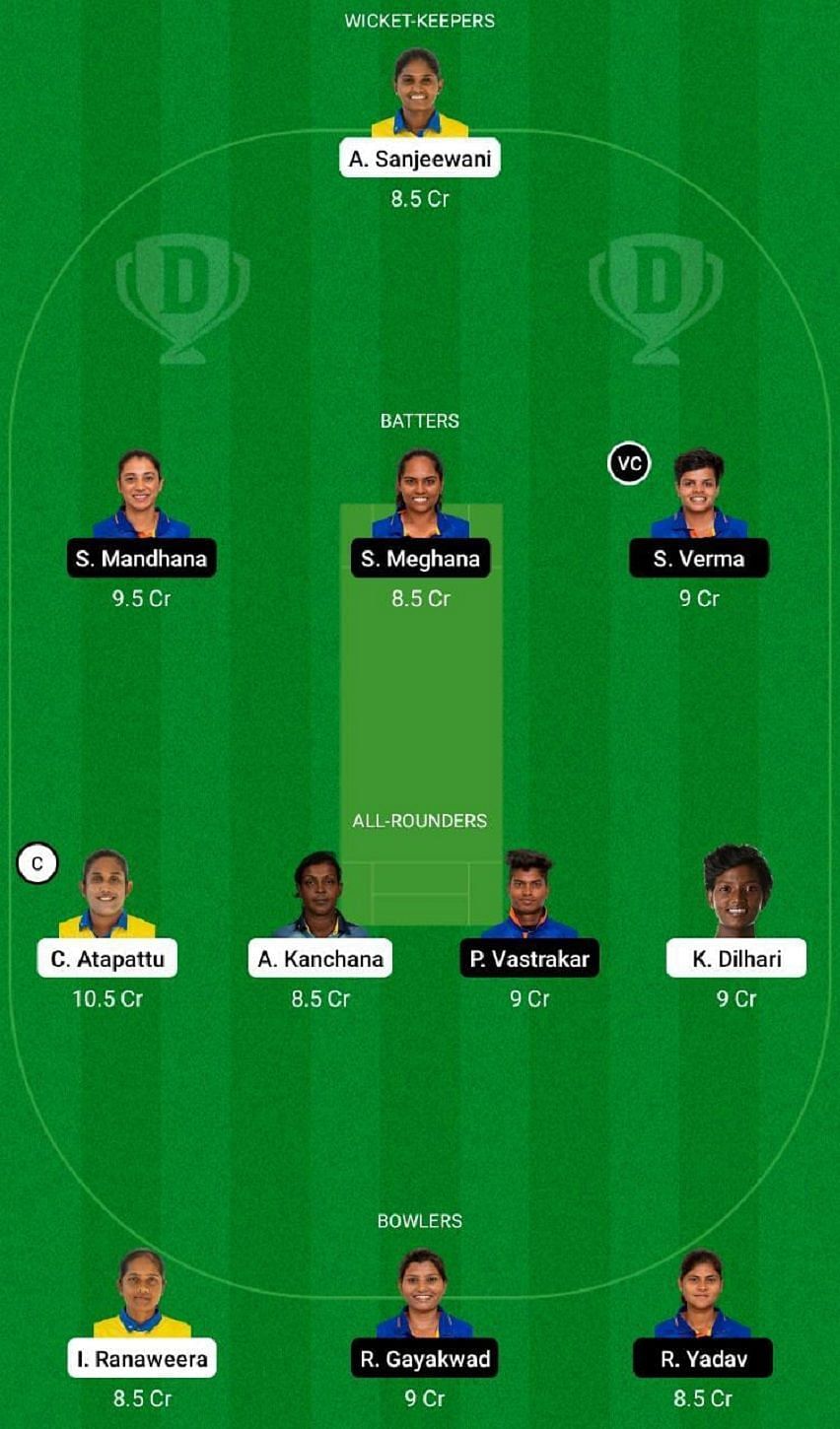 Fantasy Suggestion #1: Anushka Sanjeewani, Smriti Mandhana, Shafali Verma, Sabbhineni Meghana, Chamari Athapaththu, Ama Kanchana, Pooja Vastrakar, Kavisha Dilhari, Inoka Ranaweera, Rajeshwari Gayakwad and Radha Yadav.