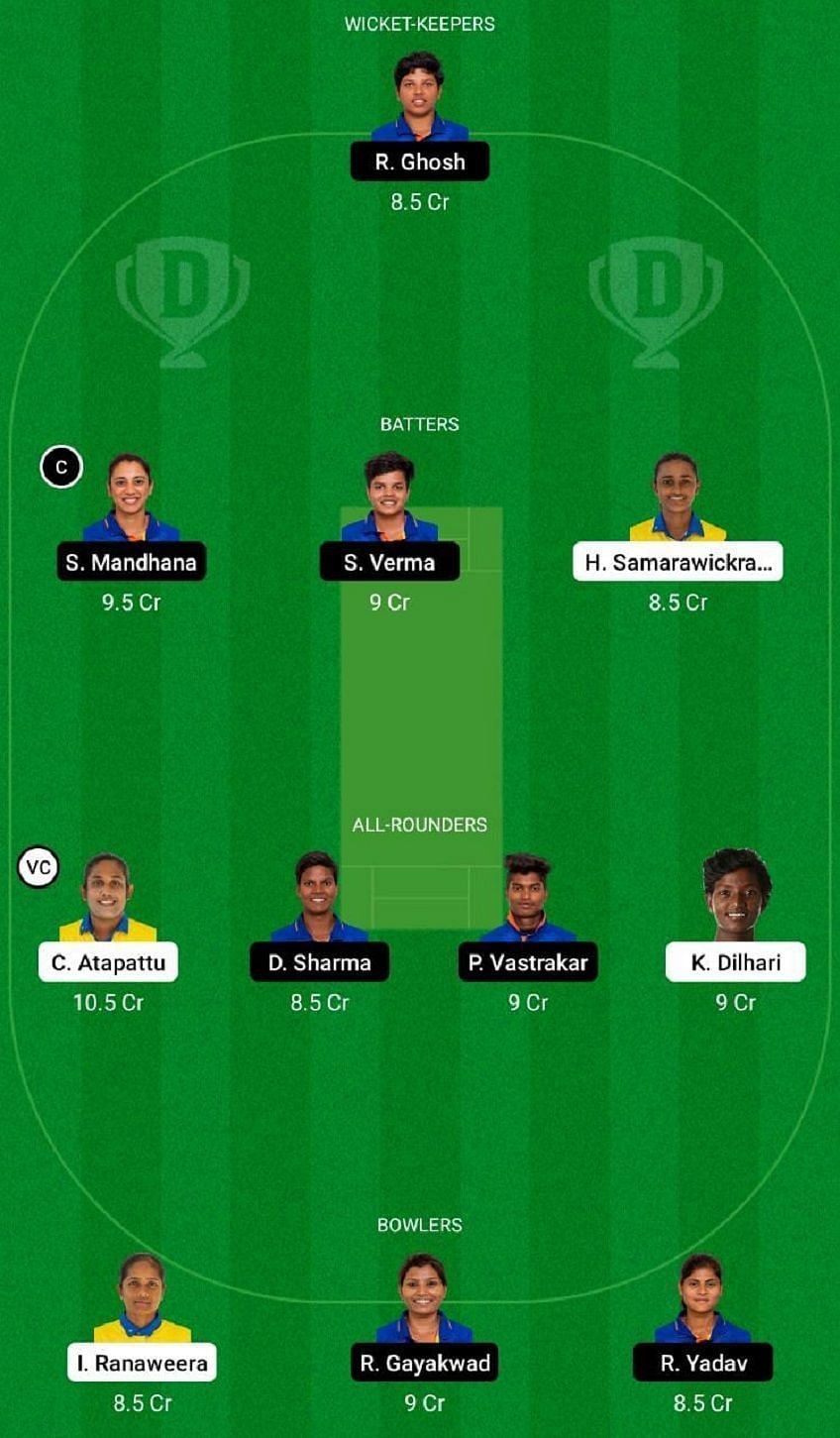 Fantasy Suggestion #1: Richa Ghosh, Smriti Mandhana, Shafali Verma, Harshitha Madavi, Chamari Athapaththu, Deepti Sharma, Pooja Vastrakar, Kavisha Dilhari, Inoka Ranaweera, Rajeshwari Gayakwad and Radha Yadav.