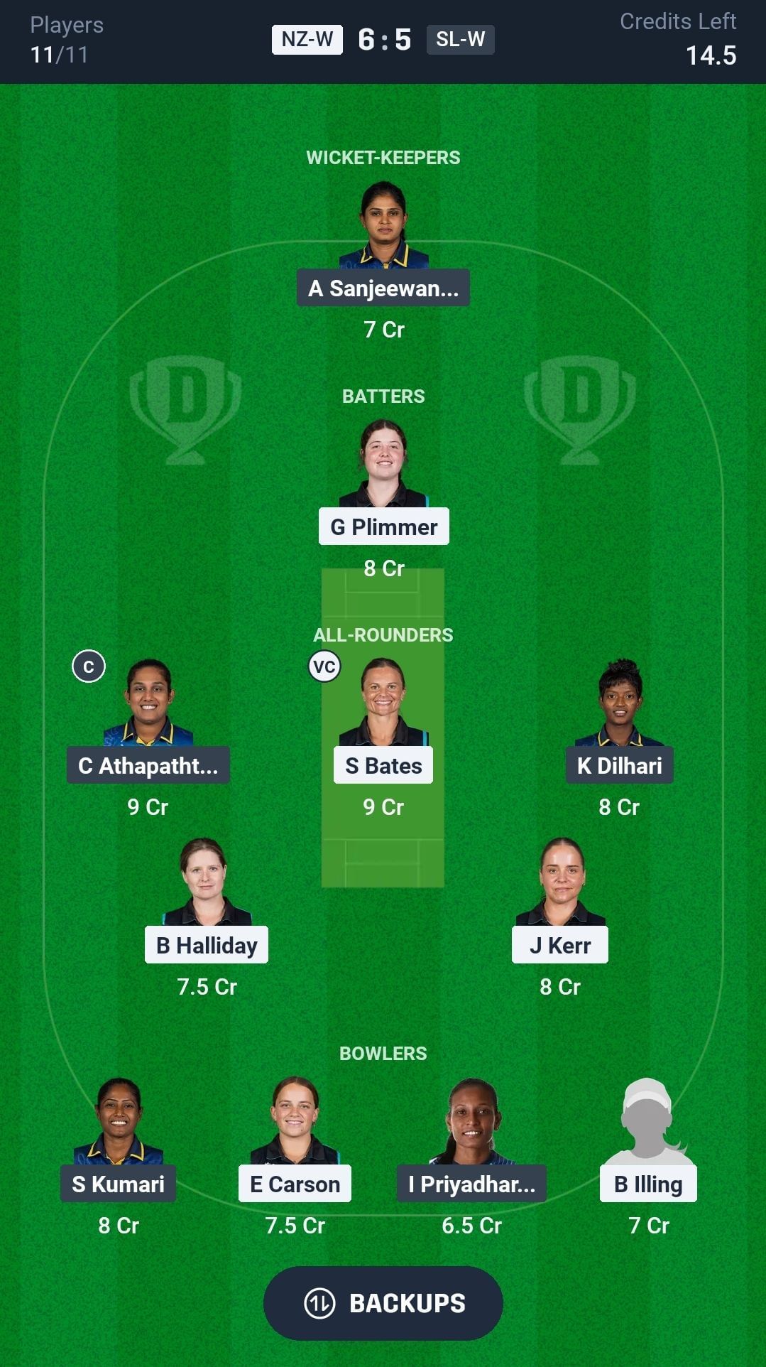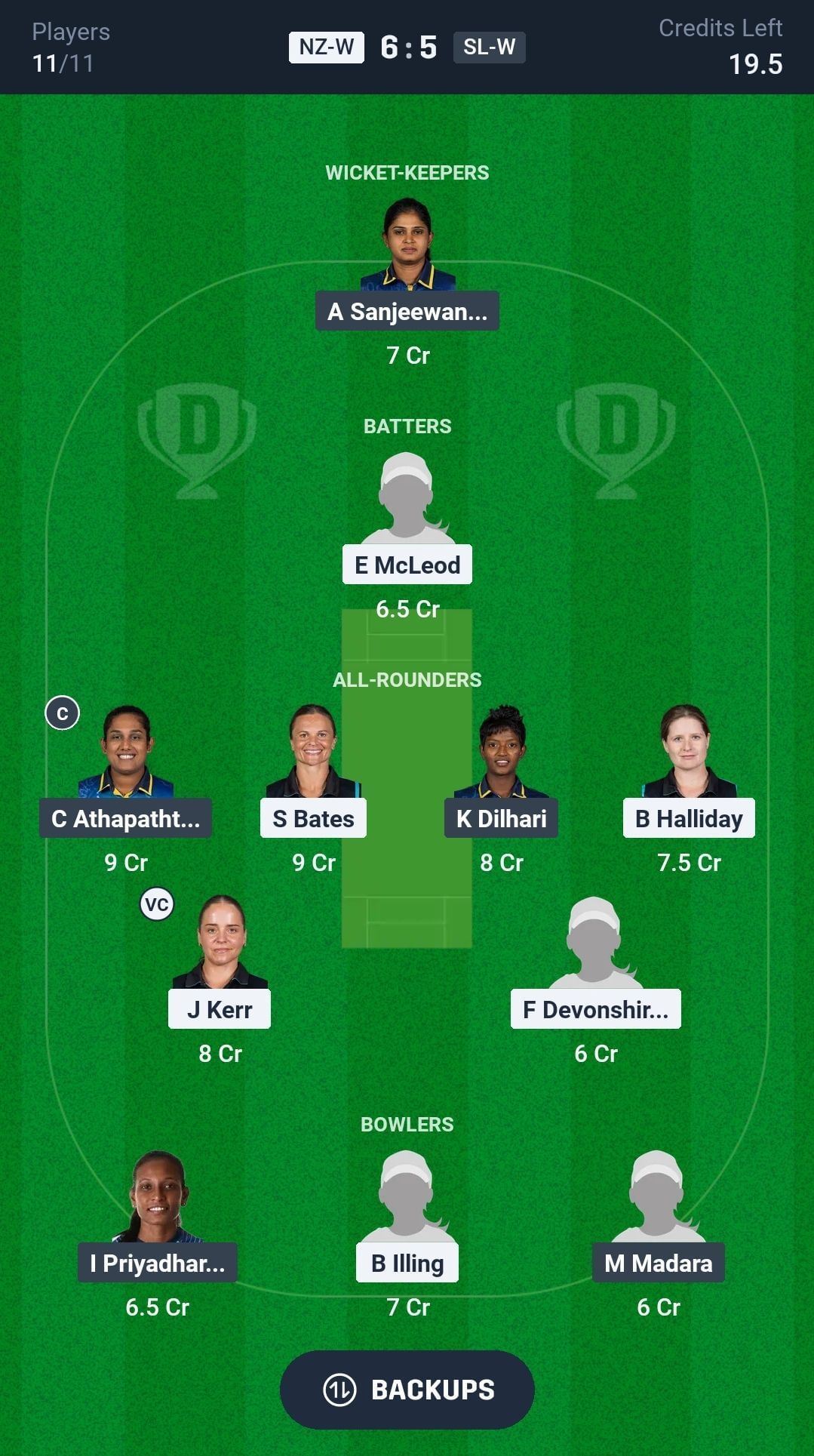 S Bates and C Athapaththu are the best all-rounder picks for the Dream11 team. Both will play a crucial role for their teams in today's match. C Athapaththu will open the innings and complete her quota of overs. She has smashed 87 runs and taken 1 wicket in the last two matches. J Kerr is another good all-rounder for today's match.