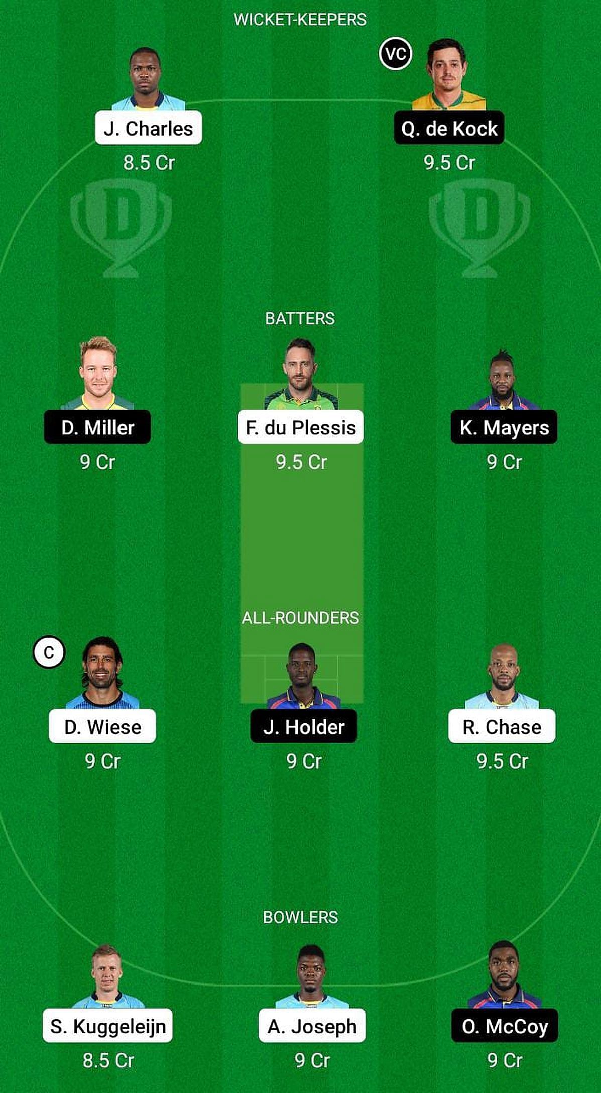 Johnson Charles, Faf du Plessis (c), Ackeem Auguste, Roston Chase, Roshon Primus, Tim David, Niroshan Dickwella (wk), David Wiese, Alzarri Joseph, Scott Kuggeleijn, Jeavor Royal