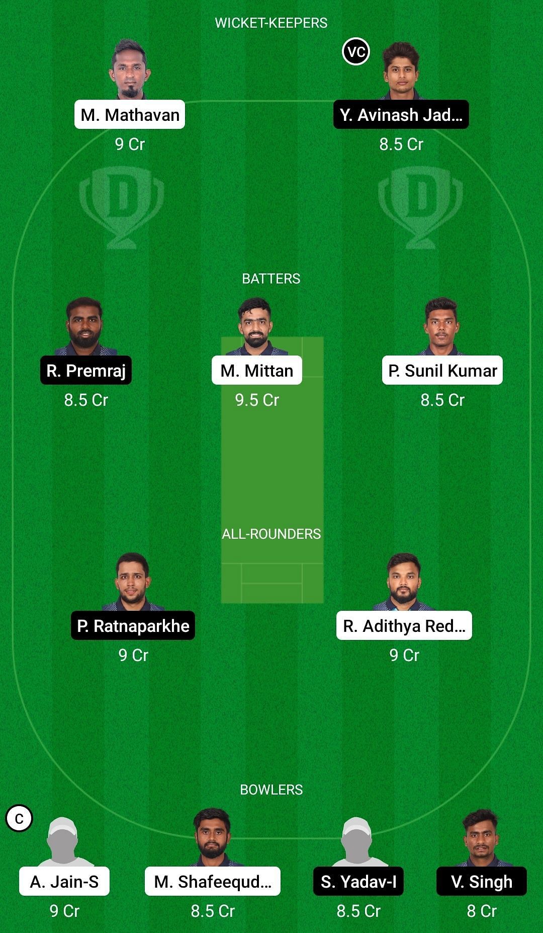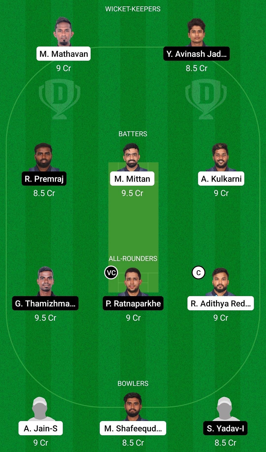 Fantasy Suggestion #1: M Mathavan, Yash Avinash Jadhav, R Premraj, Mohit Mittan, Abhilash Kulkarni, G Thamizhmani, Paras Ratnaparkhe, R Adithya Reddy, Akshay Jain S, Mohammed Shafeequddin, Saurabh Yadav
