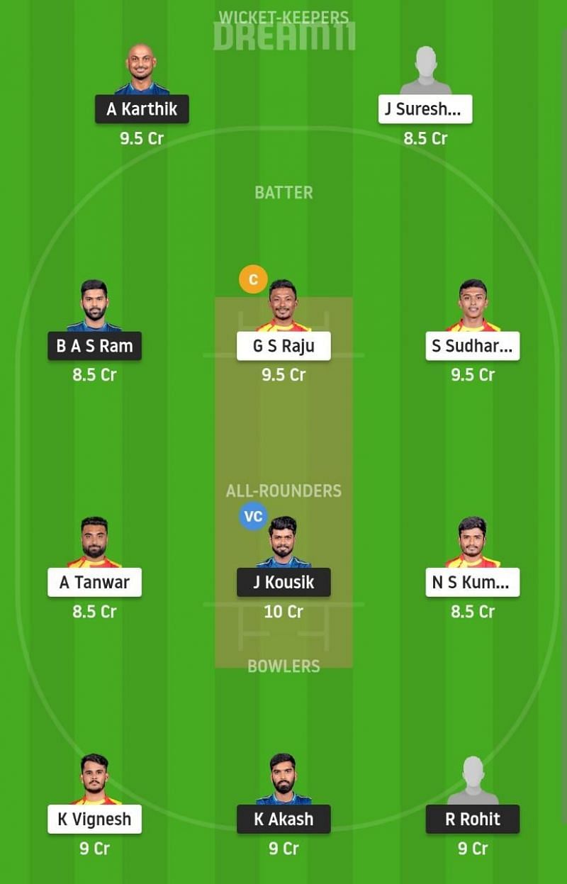 Fantasy Suggestion #1: J Suresh Kumar, A Karthik, G S Raju, S Sudarshan, B A S Ram, J Kousik, N S Kumaran, A Tanwar, R Rohit, K Akash, K Vignesh