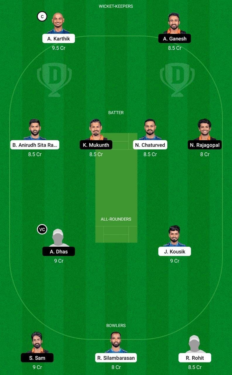 Arun Karthik (wk), K Rajkumar, Anirudh Sita Ram, NS Chaturved, Jagatheesan Kousik, M Shajahan, R Mithun, Rohit Ramalingam, R Silambarasan, Kiran Akash and Aushik Srinivas