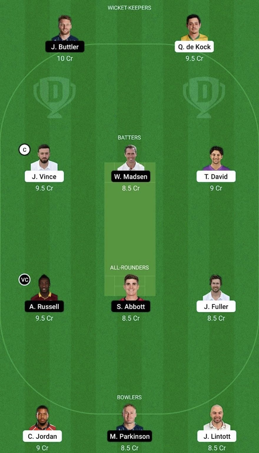 Fantasy Suggestion #1: Jos Buttler, Quinton de Kock, James Vince, Wayne Madsen, Tim David, Andre Russell, Sean Abbott, James Fuller, Chris Jordan, Matt Parkinson and Jake Lintott.