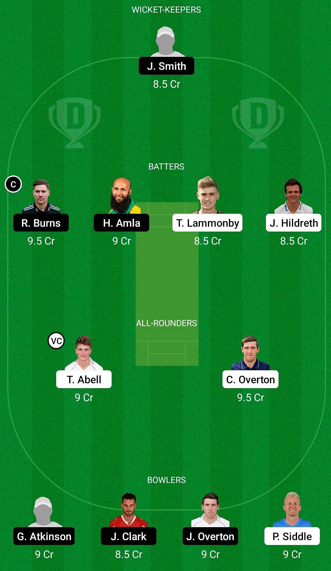 Surrey: Rory Burns (c), Ryan Patel, Hashim Amla, Jamie Smith (wk), Cameron Steel, Will Jacks, Gus Atkinson, Jordan Clark, Jamie Overton, Daniel Worrall, Amar Virdi