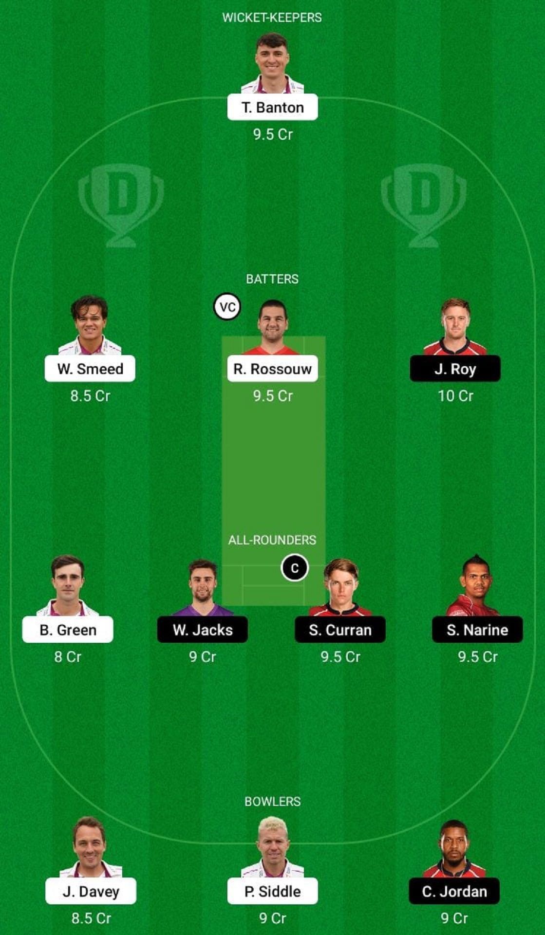 Fantasy Suggestion #1: Tom Banton, Rilee Rossouw, Will Smeed, Jason Roy, Will Jacks, Sam Curran, Sunil Narine, Ben Green, Chris Jordan, Josh Davey, Peter Siddle