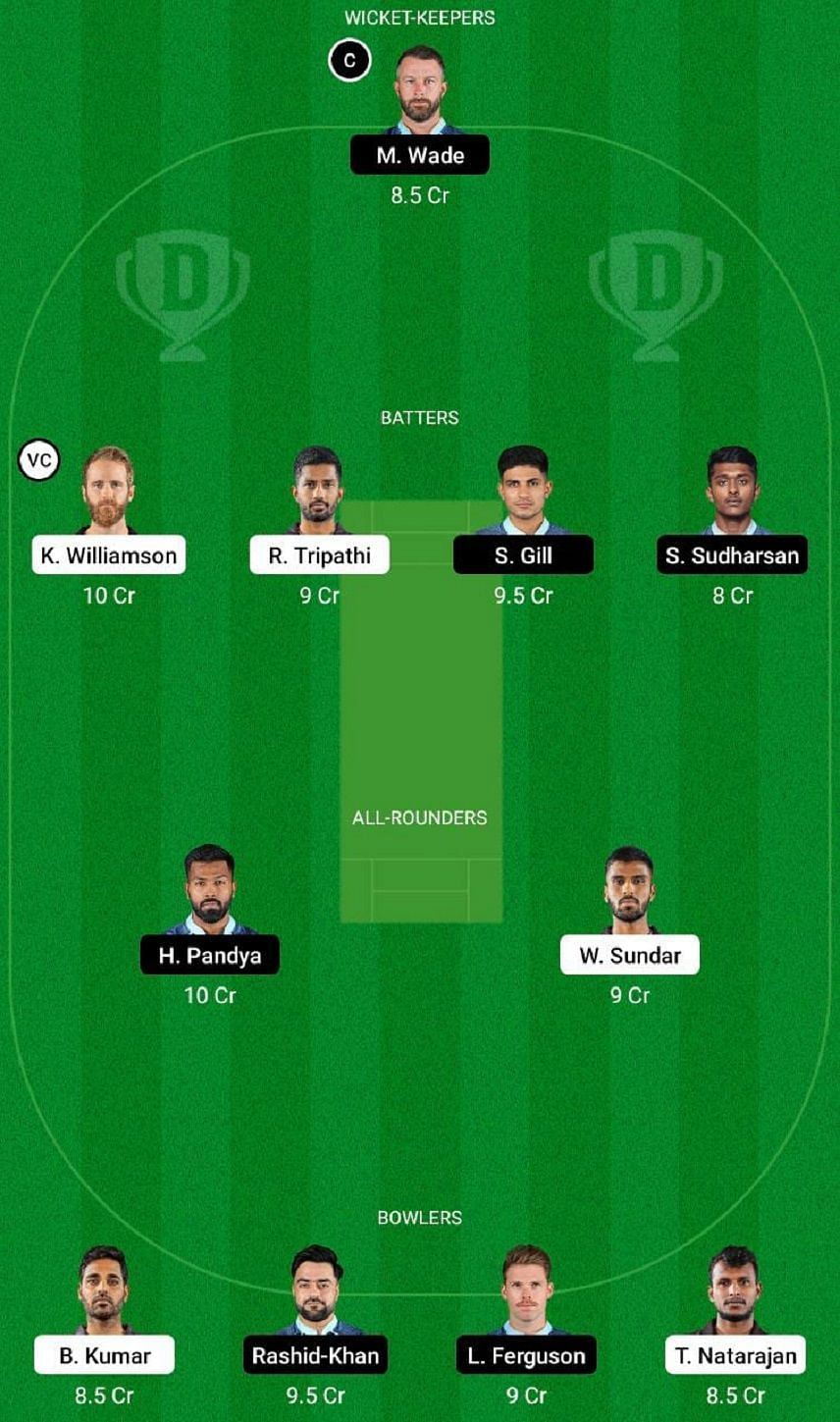 Fantasy Suggestion #1: Matthew Wade, Kane Williamson, Rahul Tripathi, Shubman Gill, Sai Sudarshan, Hardik Pandya, Washington Sundar, Bhuvneshwar Kumar, Rashid Khan, Lockie Ferguson and T Natarajan.