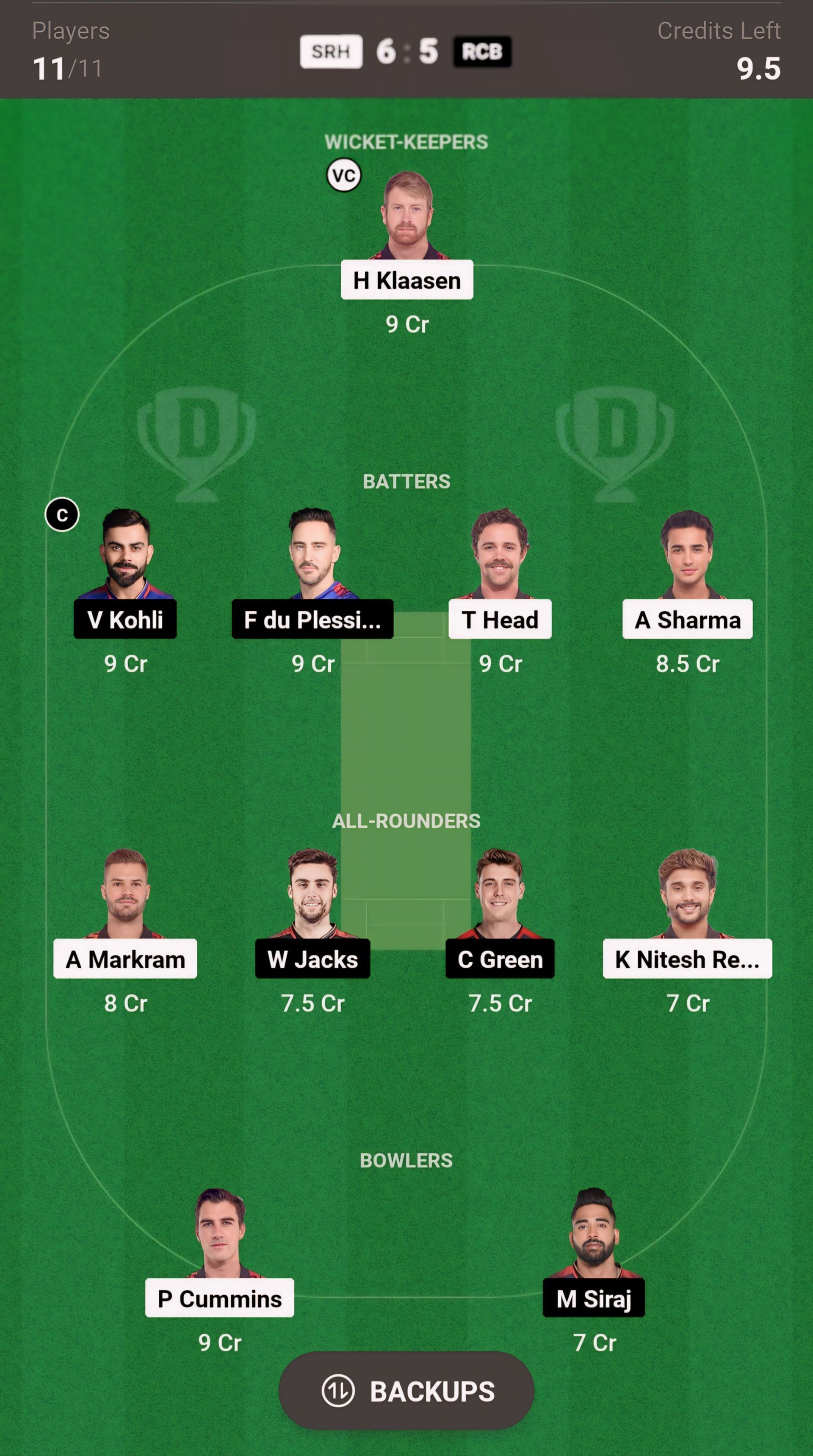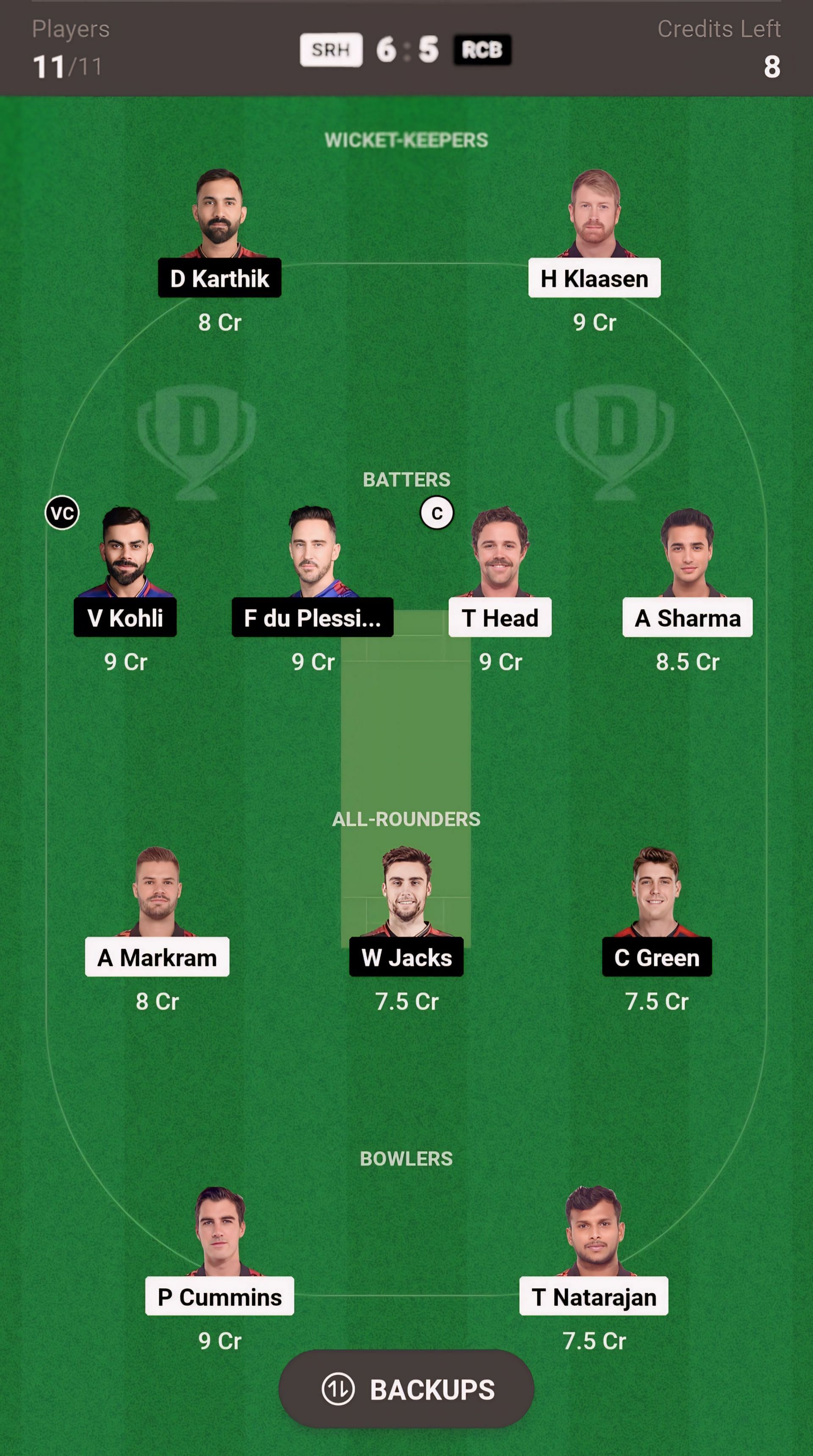 Batters: Faf du Plessis, V Kohli, T Head, A Sharma