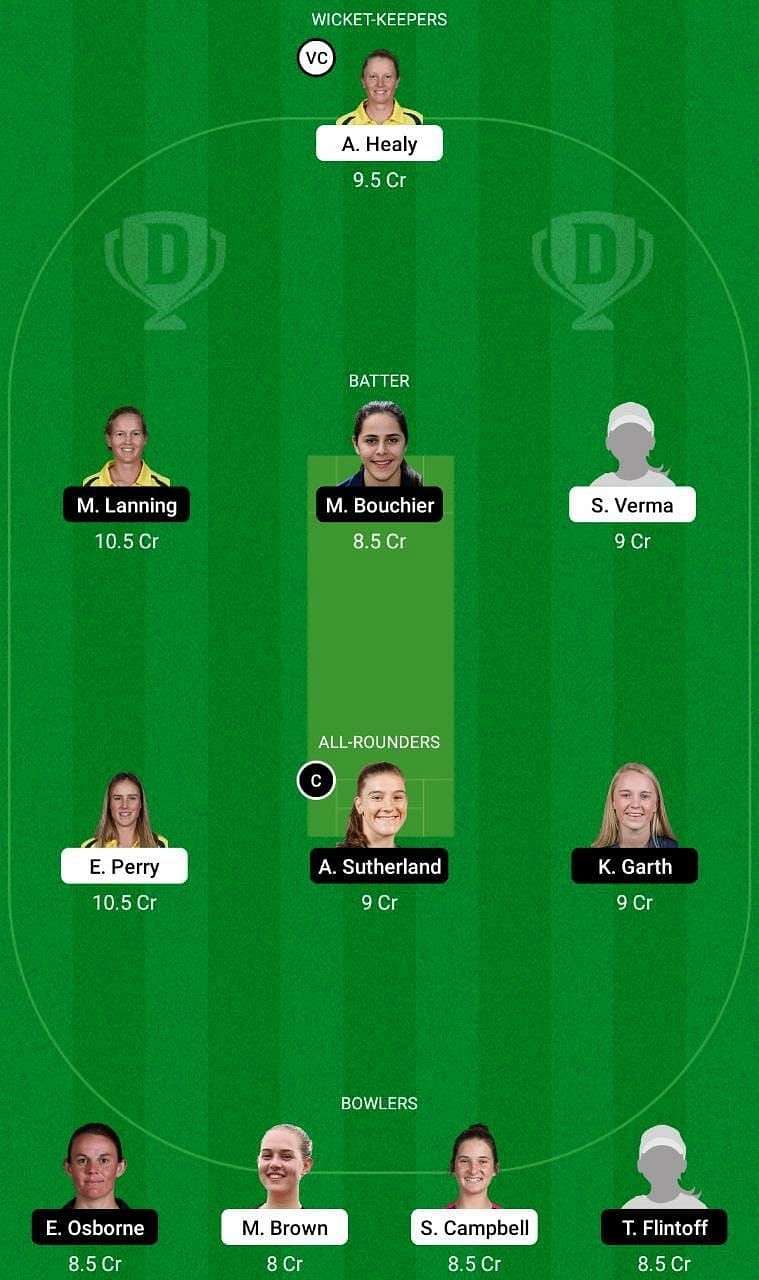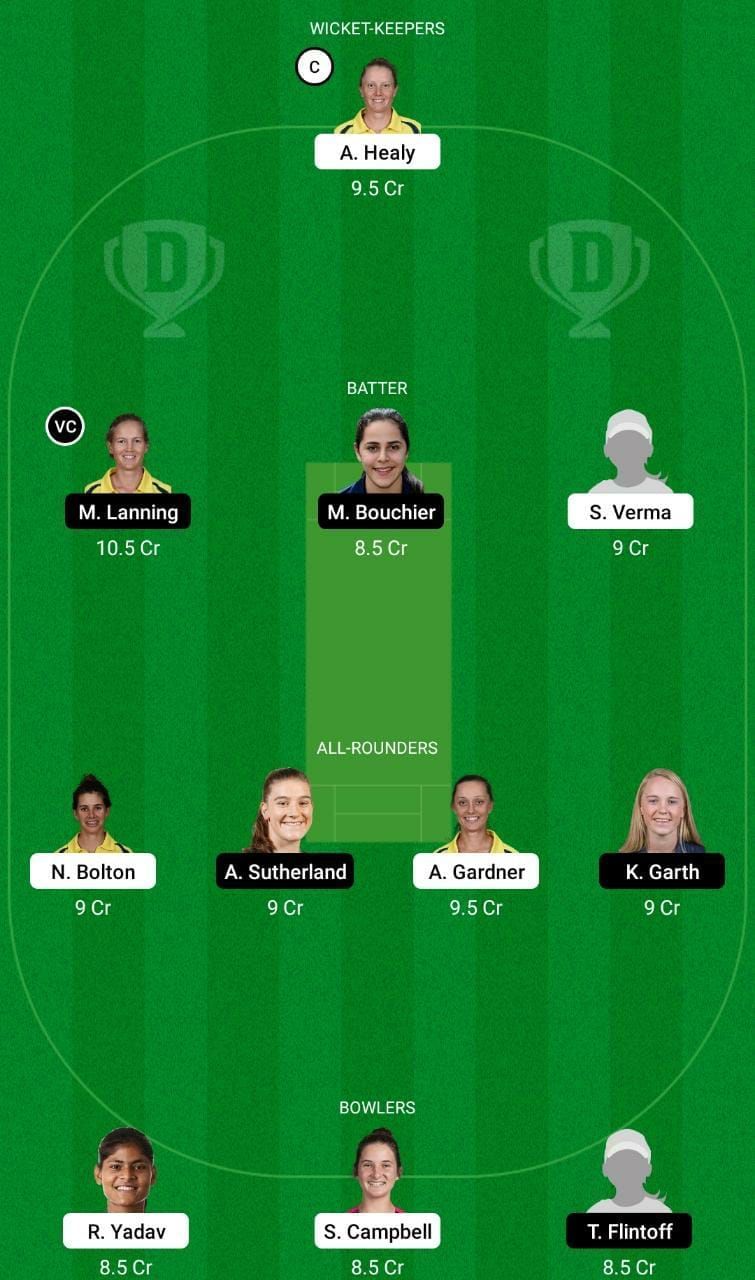 Fantasy Suggestion #1: Alyssa Healy, Meg Lanning, Maia Bouchier, Shafali Verma, Nicole Bolton, Annabel Sutherland, Ashleigh Gardner, Kim Garth, Radha Yadav, Stella Campbell and Tess Flintoff