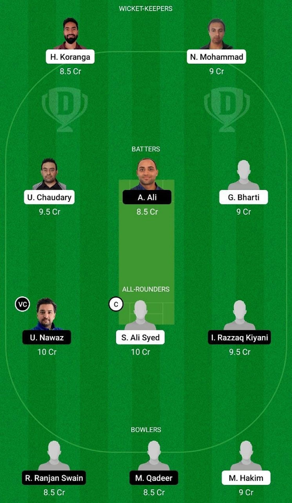Fantasy Suggestion #1: H Koranga, N Mohammad, A Ali, U Chaudary, G Bharti, S Ali Syed, U Nawaz, I Razzaq Kiyani, M Qadeer, R Ranjan Swain, M Hakim