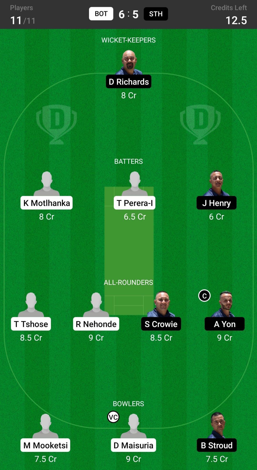 Karabo Motlhanka (c & wk), Thatayaone Tshose, Tharindu Perera, Mmoloki Mooketsi, Phemelo Silas, Valentine Mbazo, Reginald Nehonde, Boemo Kgosiemang, Katlo Piet, Vinoo Balakrishnan, Dhruv Maisuria