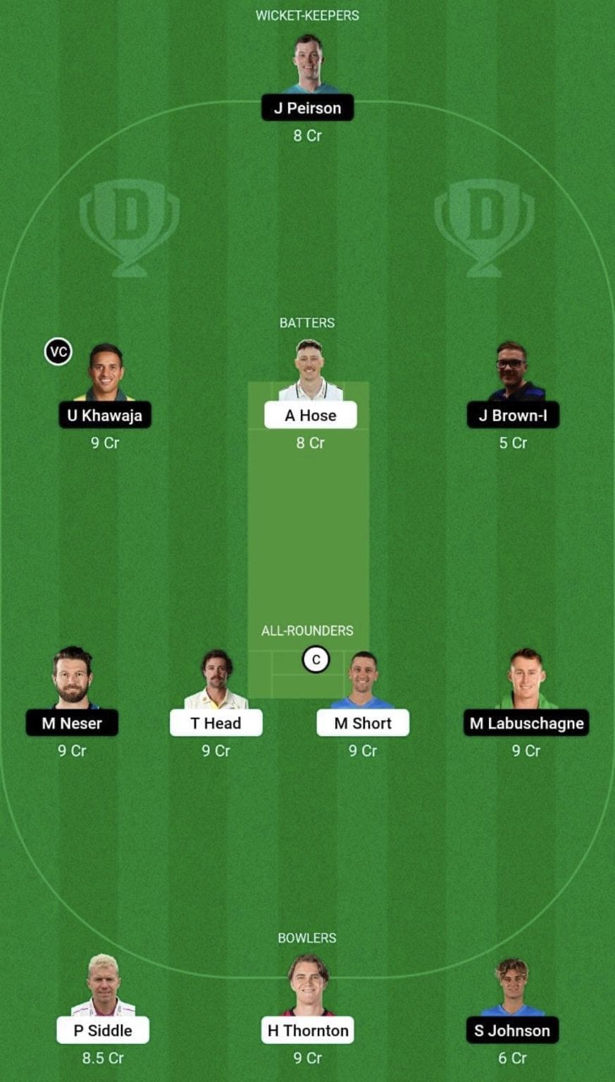 Matt Short, Alex Carey (wk), Travis Head, Adam Hose, Colin de Grandhomme, Thomas Kelly, Ben Manenti/Henry Hunt, Wes Agar, Cameron Boyce, Henry Thorton and Peter Siddle (c).
