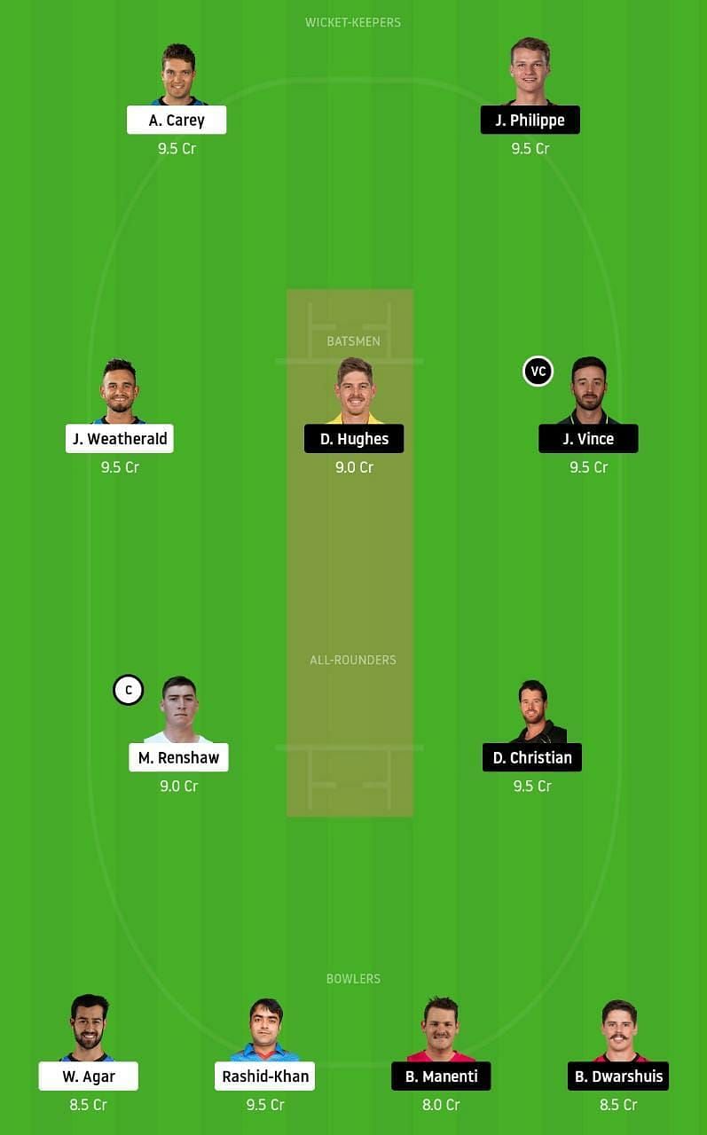 Fantasy Suggestion #1: Alex Carey, Josh Philippe, Daniel Hughes, Jake Weatherald, James Vince, Daniel Christian, Matt Renshaw, Rashid Khan, Wes Agar, Ben Dwarshuis and Ben Manenti