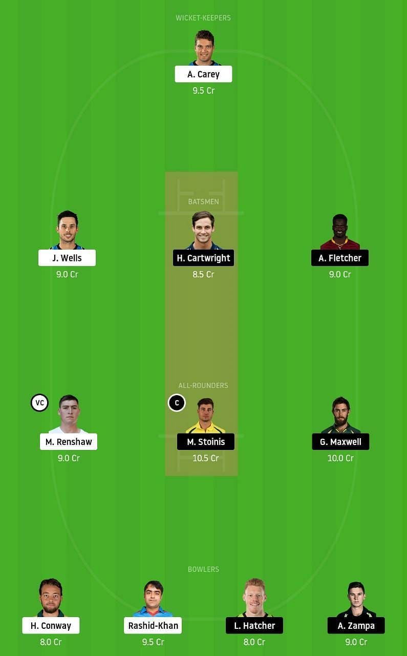 Fantasy Suggestion #1: Alex Carey, Hilton Cartwright, Jono Wells, Andre Fletcher, Glenn Maxwell, Marcus Stoinis, Matt Renshaw, Rashid Khan, Adam Zampa, Liam Hatcher, and Harry Conway