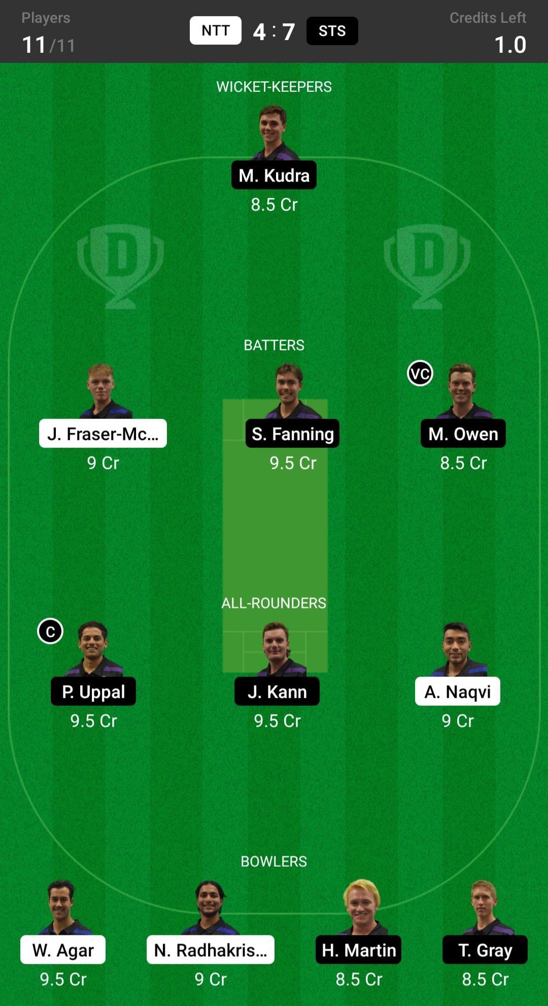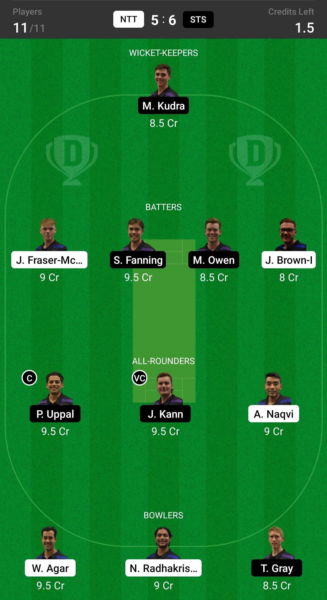 Fantasy suggestion #1: M Kudra, S Fanning, J Fraser McGurk, M Owen, J Brown, J Kann, P Uppal, A Naqvi, W Agar, N Radhakrishnan, T Gray