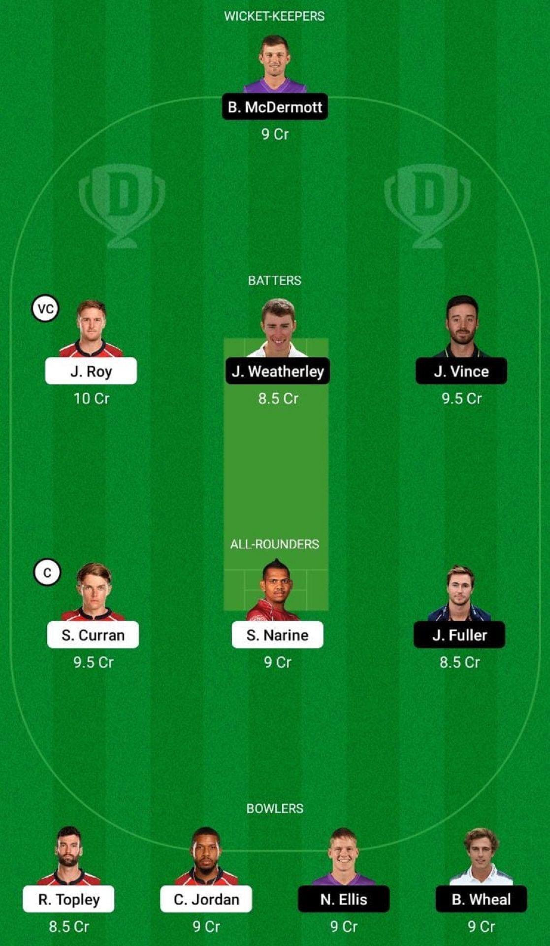 Fantasy Suggestion #1: Ben McDermott, Joe Weatherley, Jason Roy, James Vince, Sam Curran, James Fuller, Sunil Narine, Brad Wheal, Nathan Ellis, Reece Topley, Chris Jordan