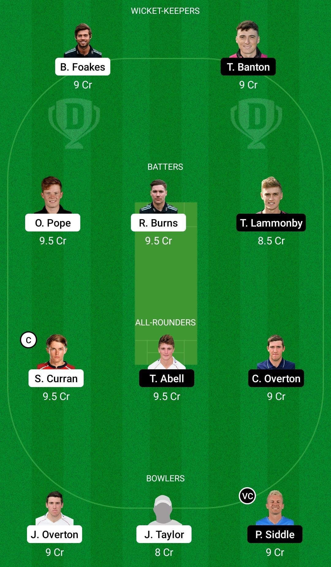 Fantasy Suggestion #2: Ben Foakes, Tom Banton, Ollie Pope, Rory Burns, Matt Renshaw, Sam Curran, Tom Abell, Craig Overton, Jamie Overton, James Taylor, Peter Siddle.